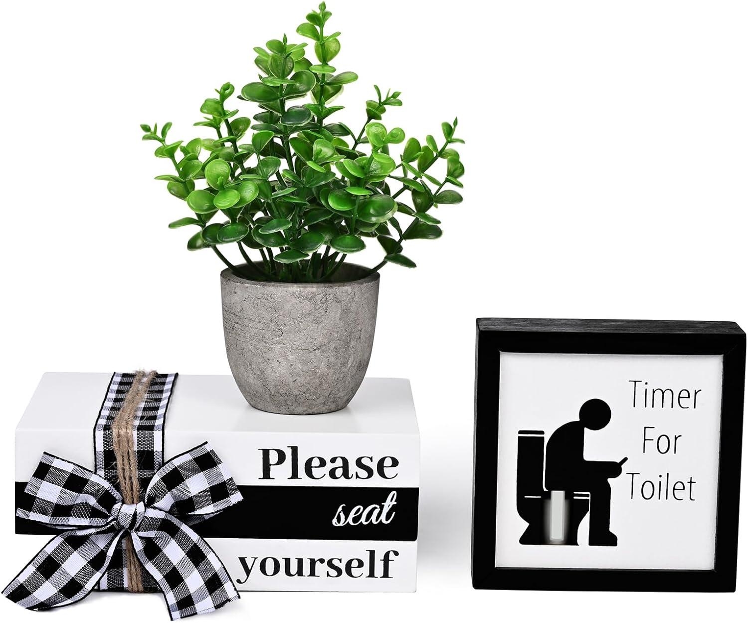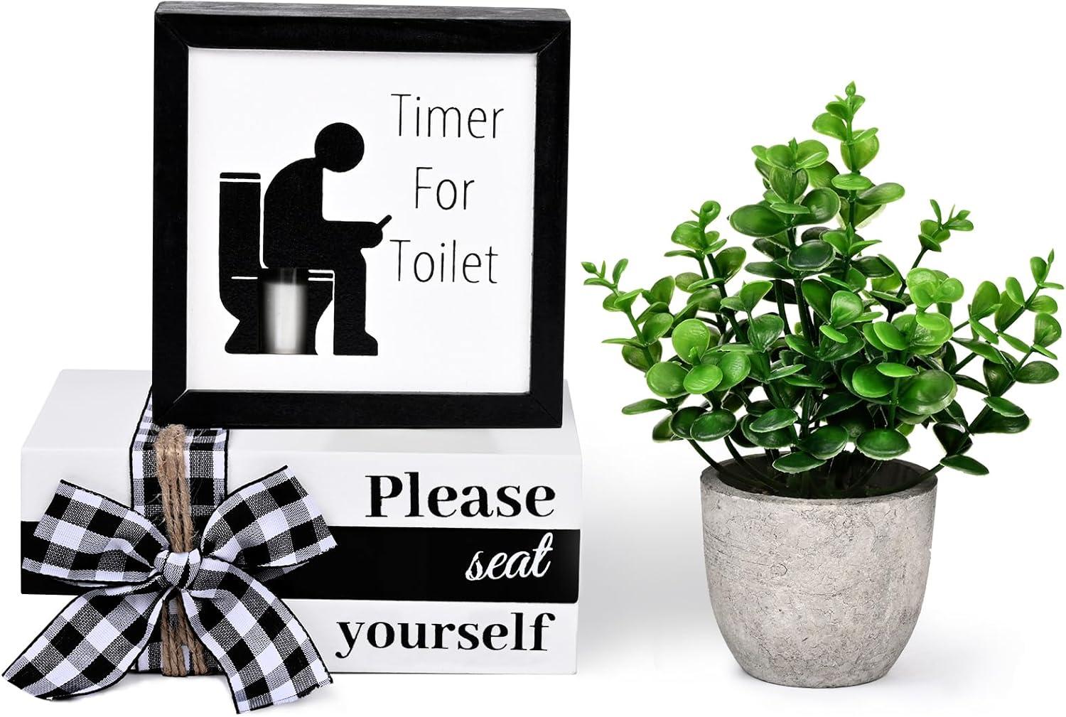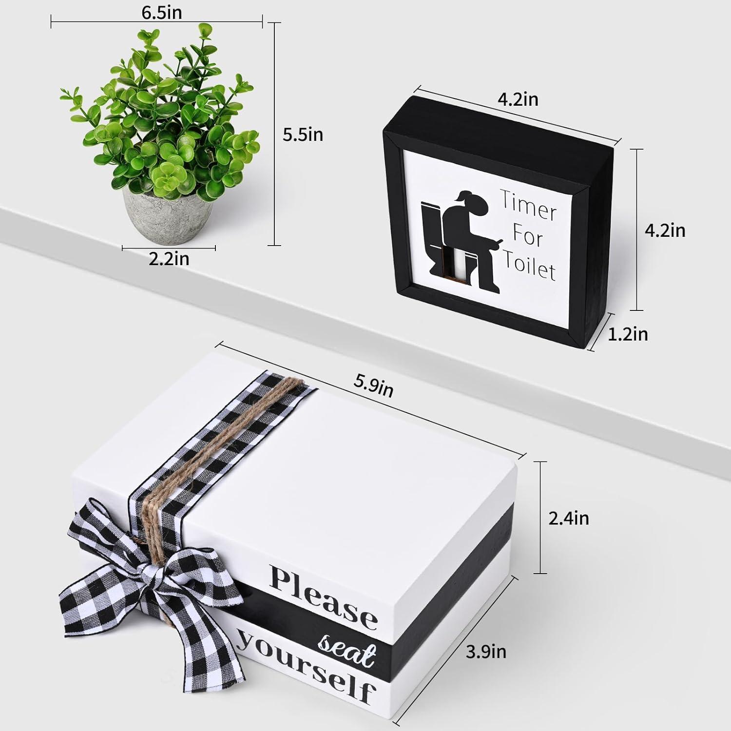 Package Includes: You'll receive a 3-piece decorative book set (bound with twine and a buffalo plaid ribbon), sized 5.9in x 3.9in x 2.4in; a 6.5in x 5.5in fake plant (2.2in x 2.0in flowerpot); and a 4.2in x 4.2in x 1.2in toilet timer. Please check the size of our wooden rustic decor before purchase