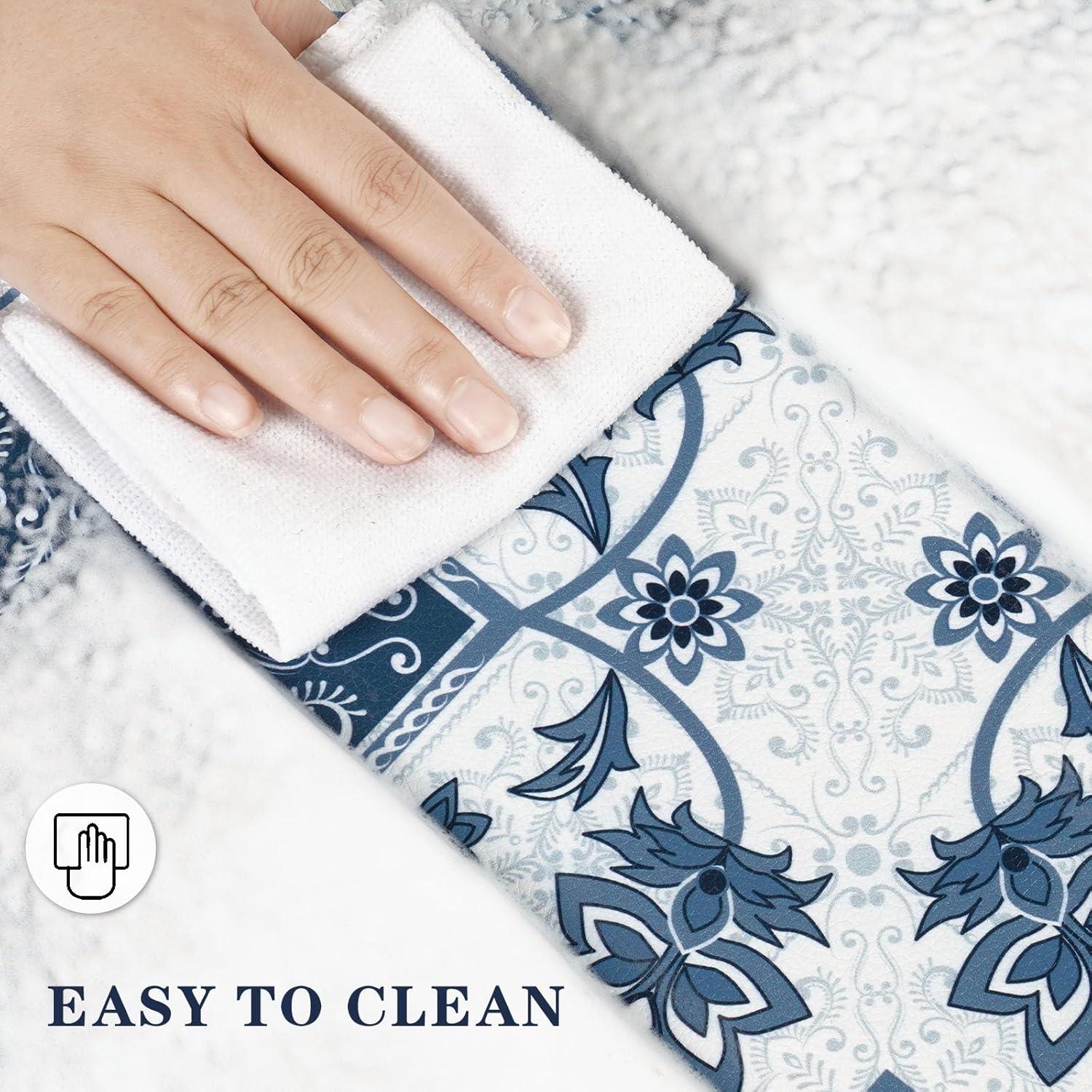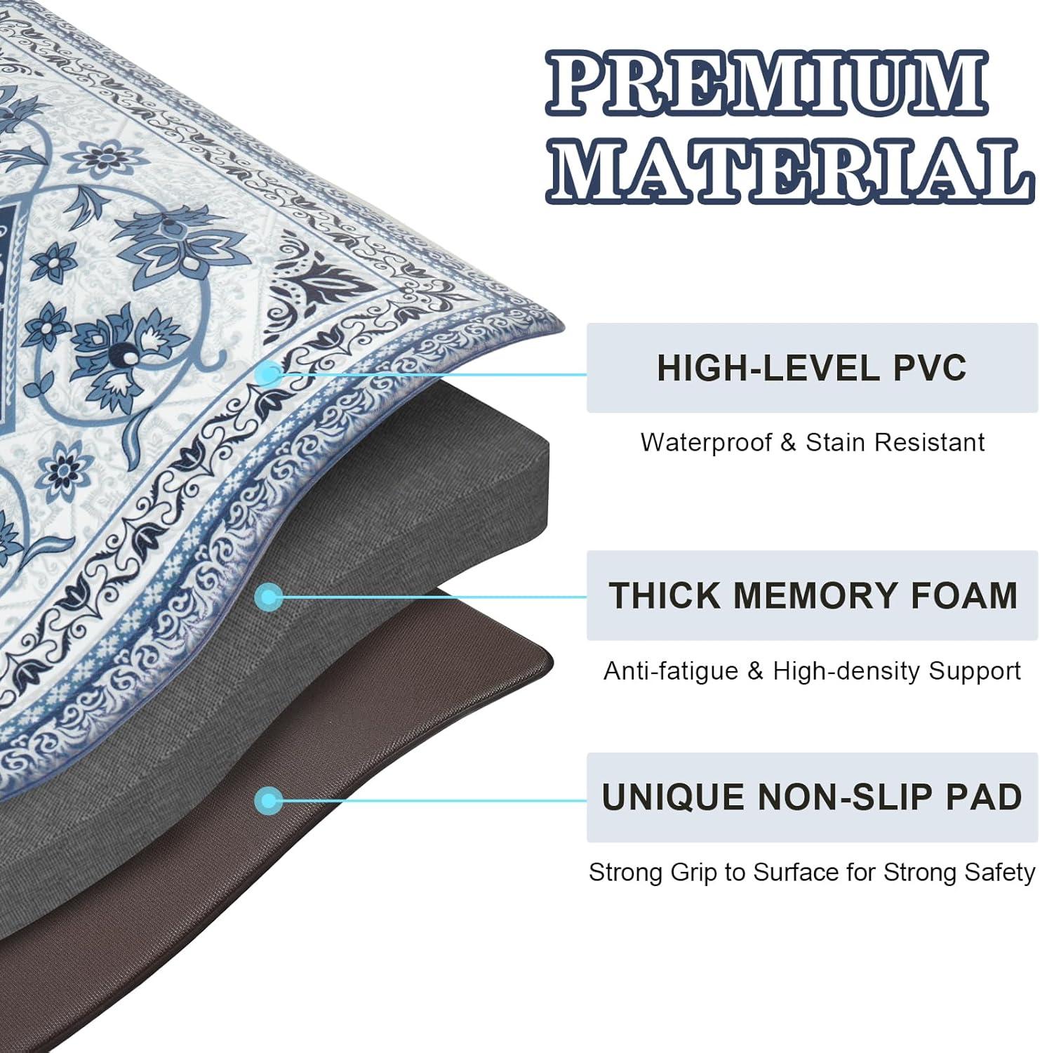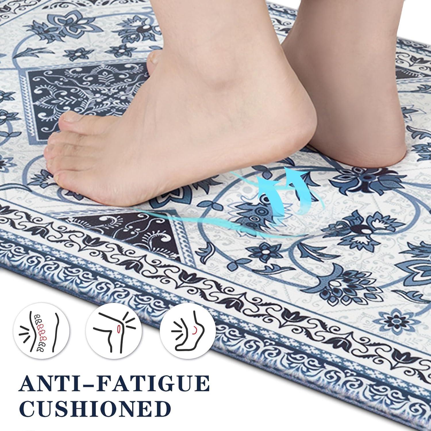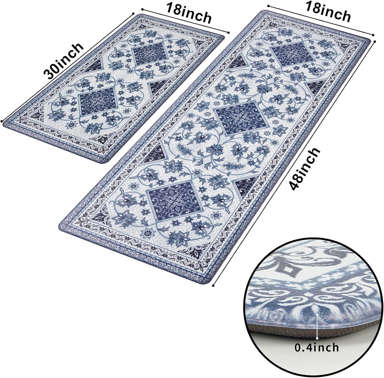 ANTI FATIGUE: Blue boho kitchen rugs sets of 2 are made of premium high density PVC material, which is durable, oil proof and waterproof, can offer long lasting support against deformation. This ergonomically engineered mat is sure to provide comfort and help relieve pressure on your feet, knees, lower back, and joints.