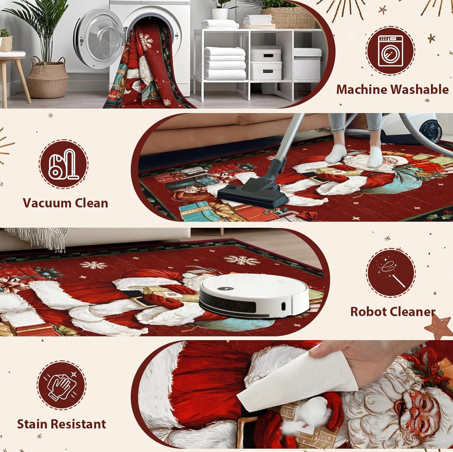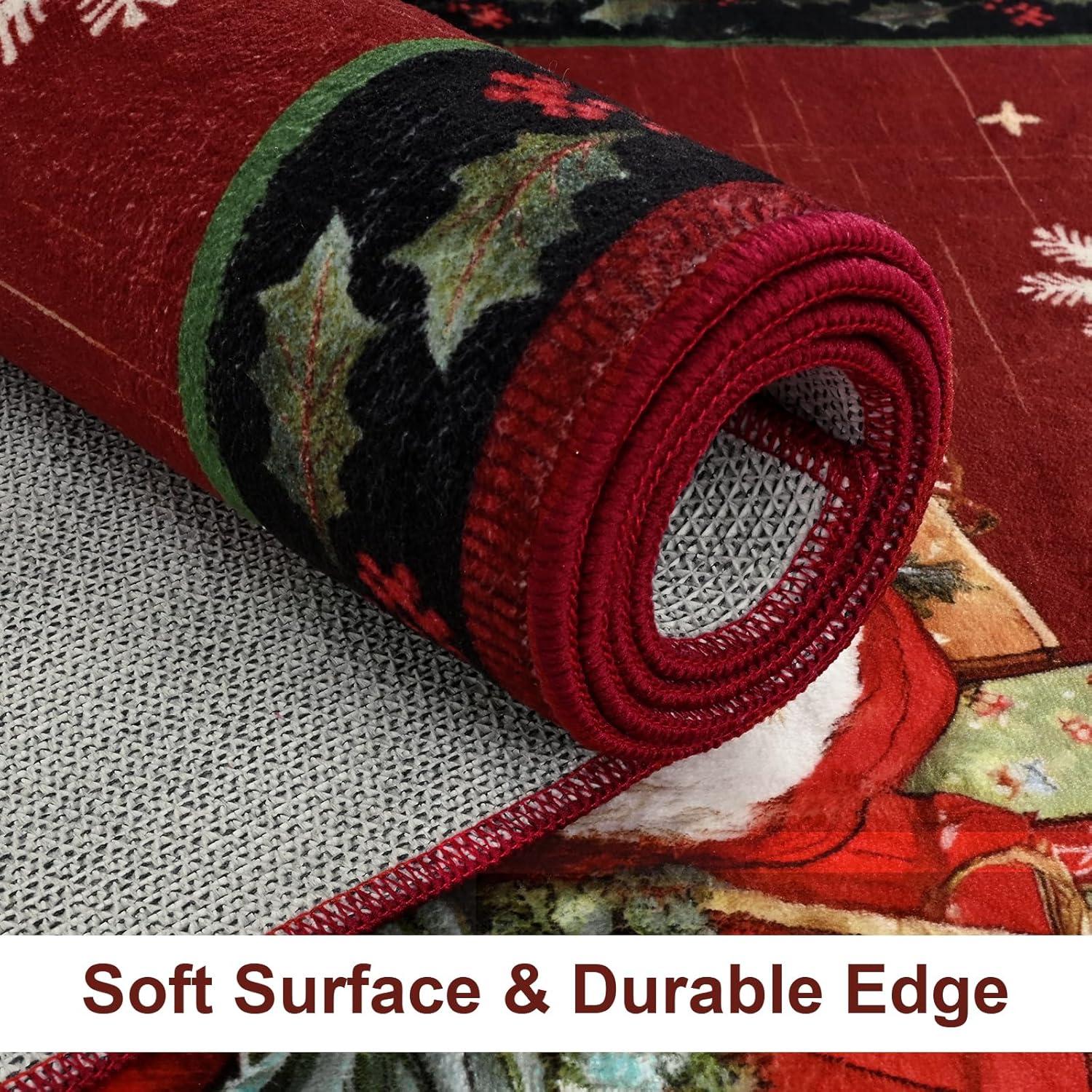 Easy Clean & Low-Pile: Christmas washable rug crafted from soft, low-pile faux wool that is completely machine washable for effortless cleanup. The stain-resistant surface easily handles spills from festive drinks and treats, maintaining its beauty season after season