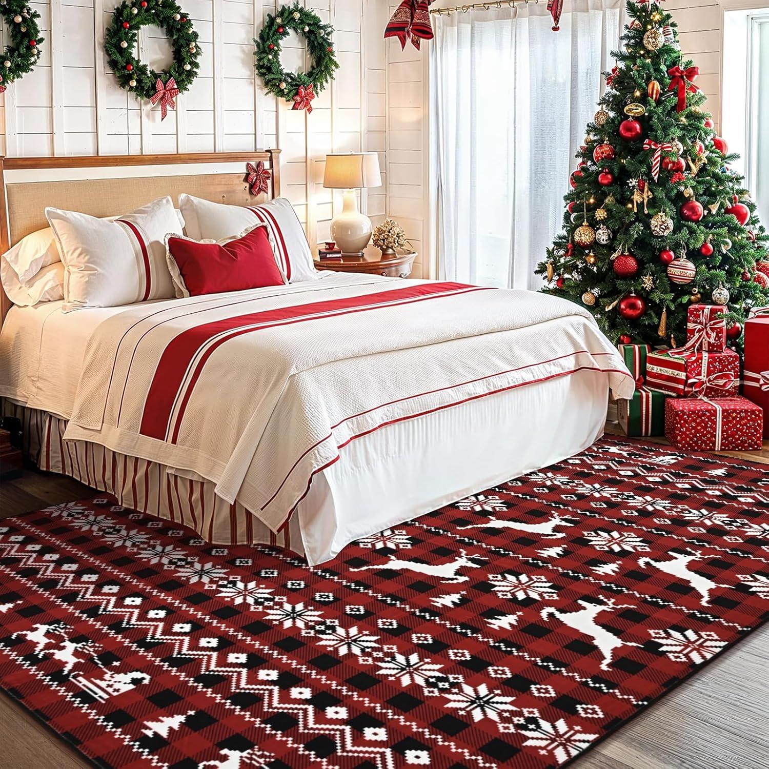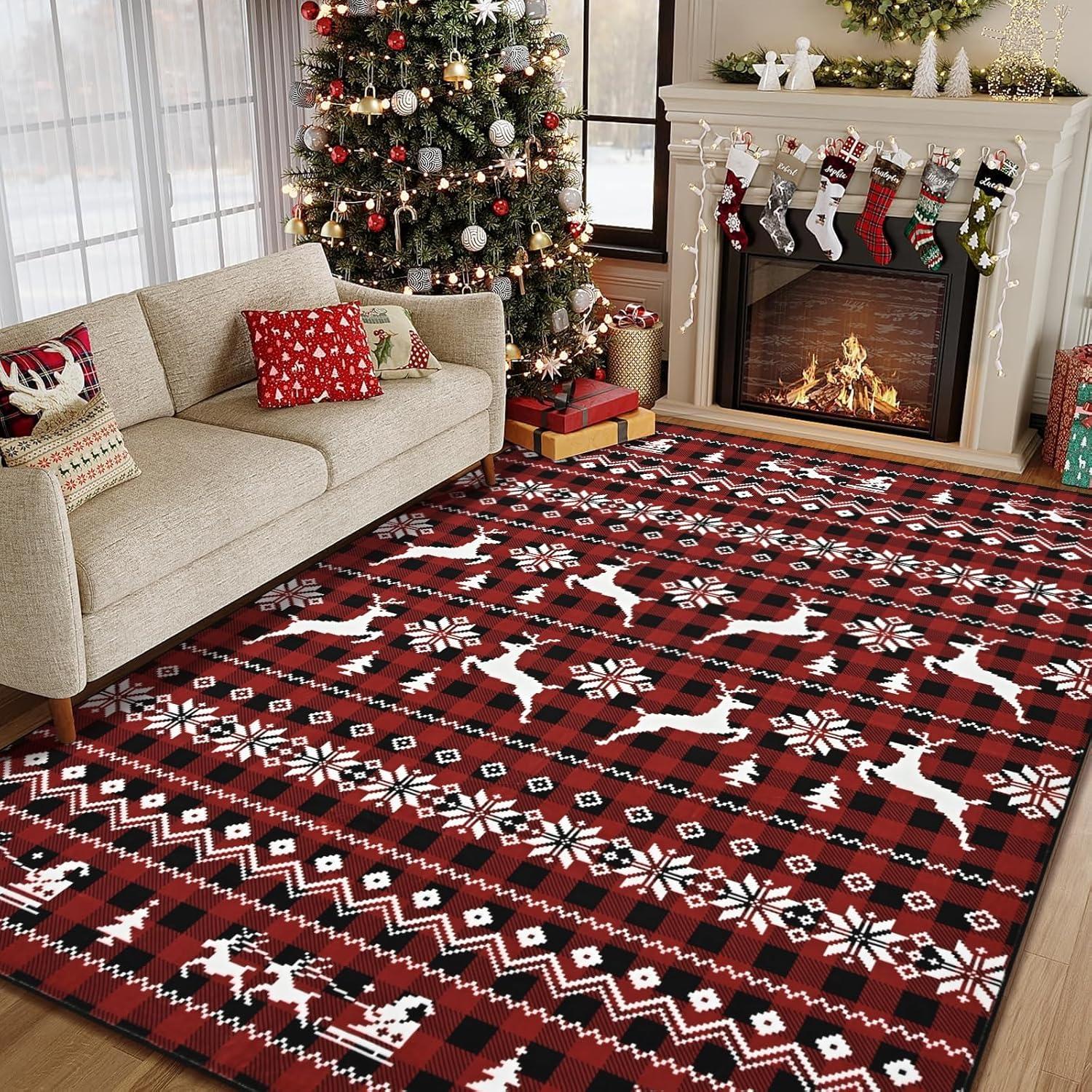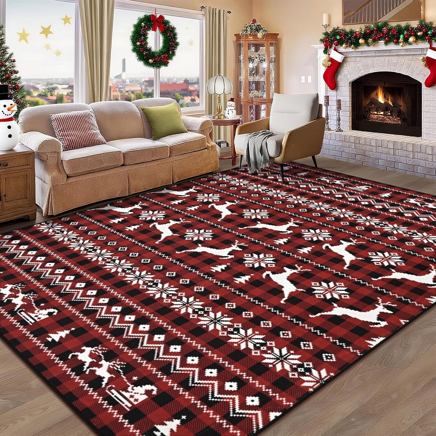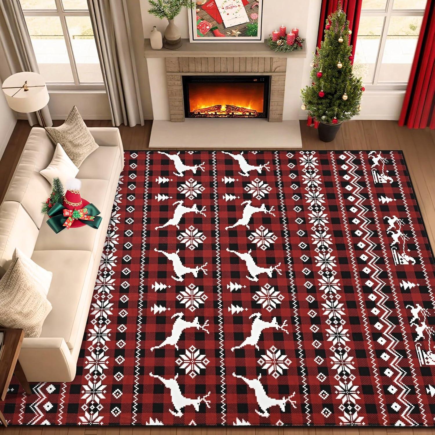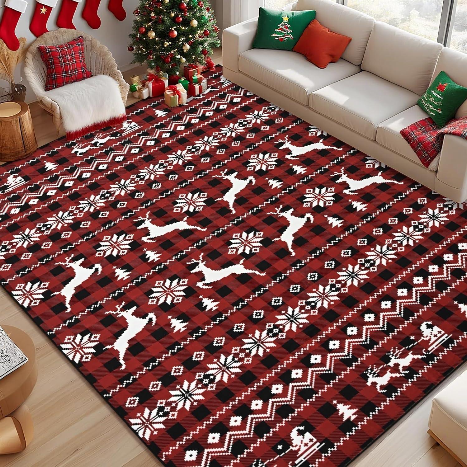 Christmas Plaid Design: This Christmas living room rug boasts a classic buffalo plaid pattern. Pairs well with snowflakes and reindeer decor, instantly amping up Christmas charm in any space