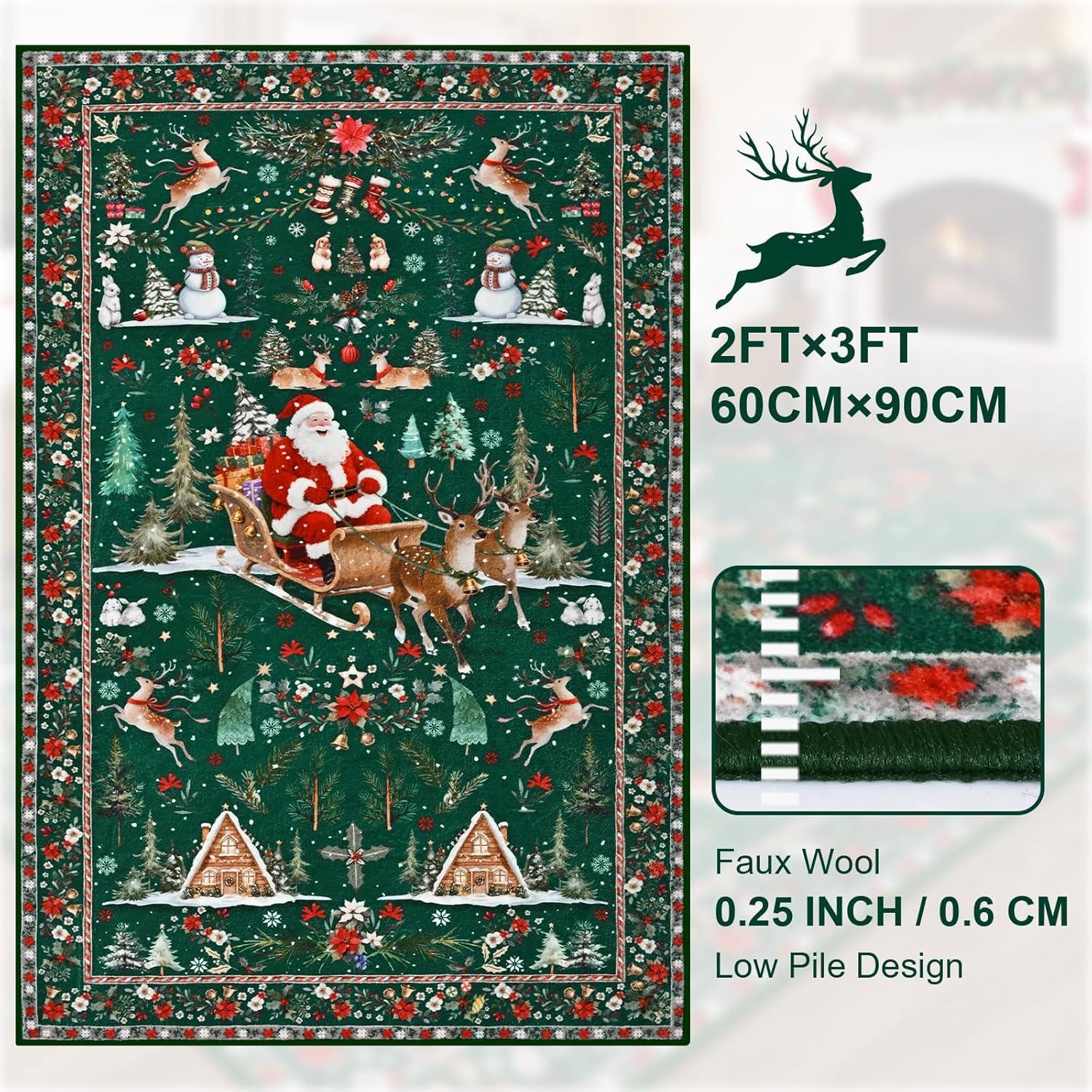 Christmas Rug 3×5: The Christmas rug for living room featuring classic vintage red tones, with playful Santa, reindeer, Christmas tree designs, make your home more Christmassy this winter. Perfect Christmas decorations