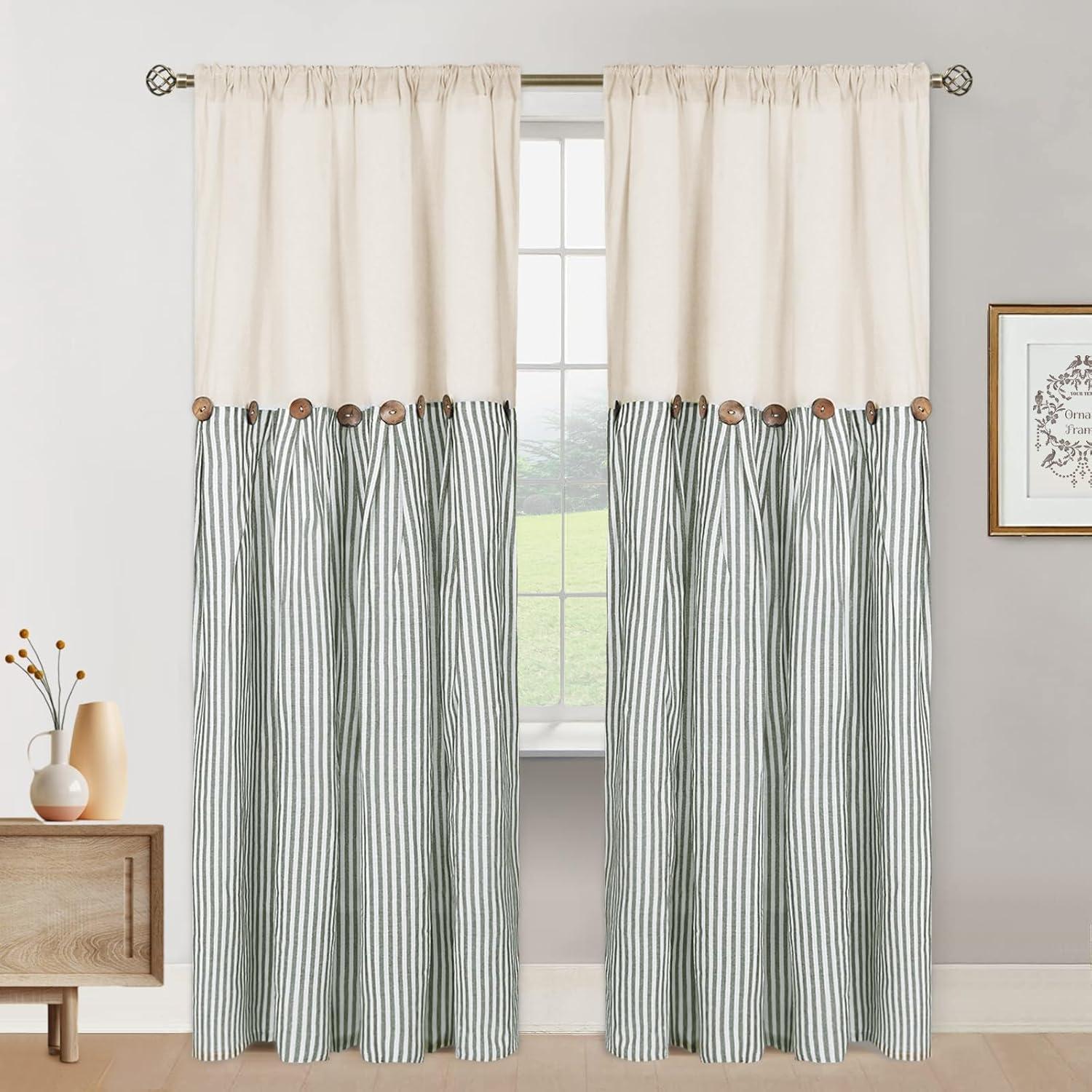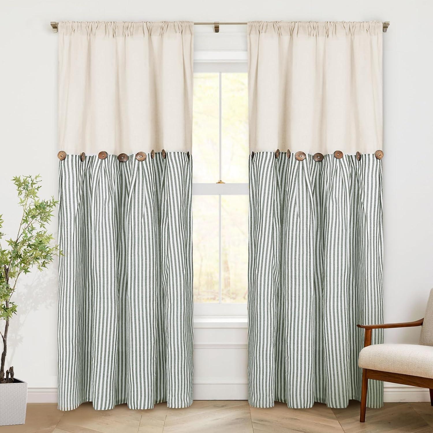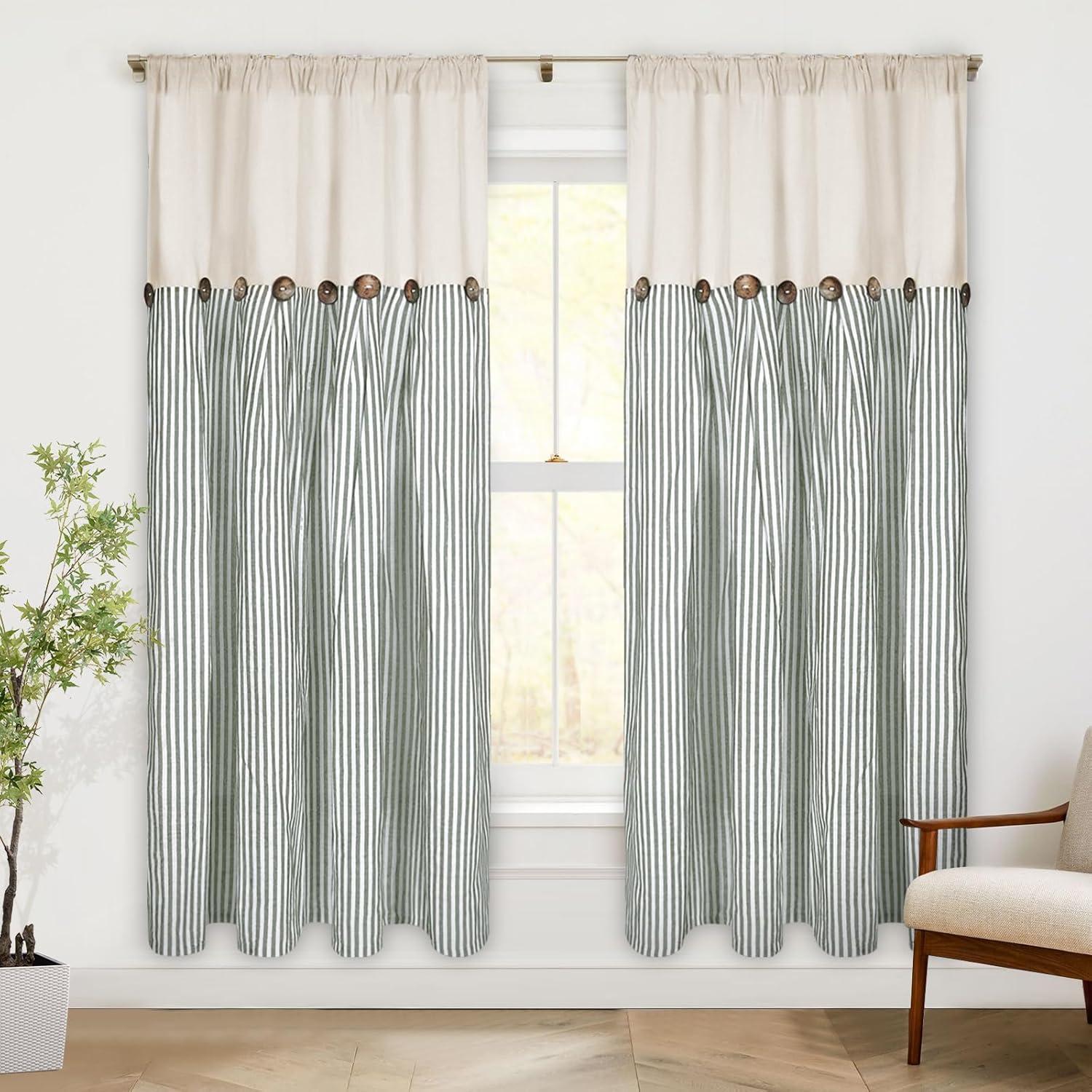 ASPMIZ Cotton Linen Farmhouse Curtains Boho Rustic Button Curtain, Linen Window Curtain Panels Green Stripe Country Curtains for Living Room Bedroom, Back Tab Window Drapes, 52 x 84 Inch, 2 Panels(Beige&green)