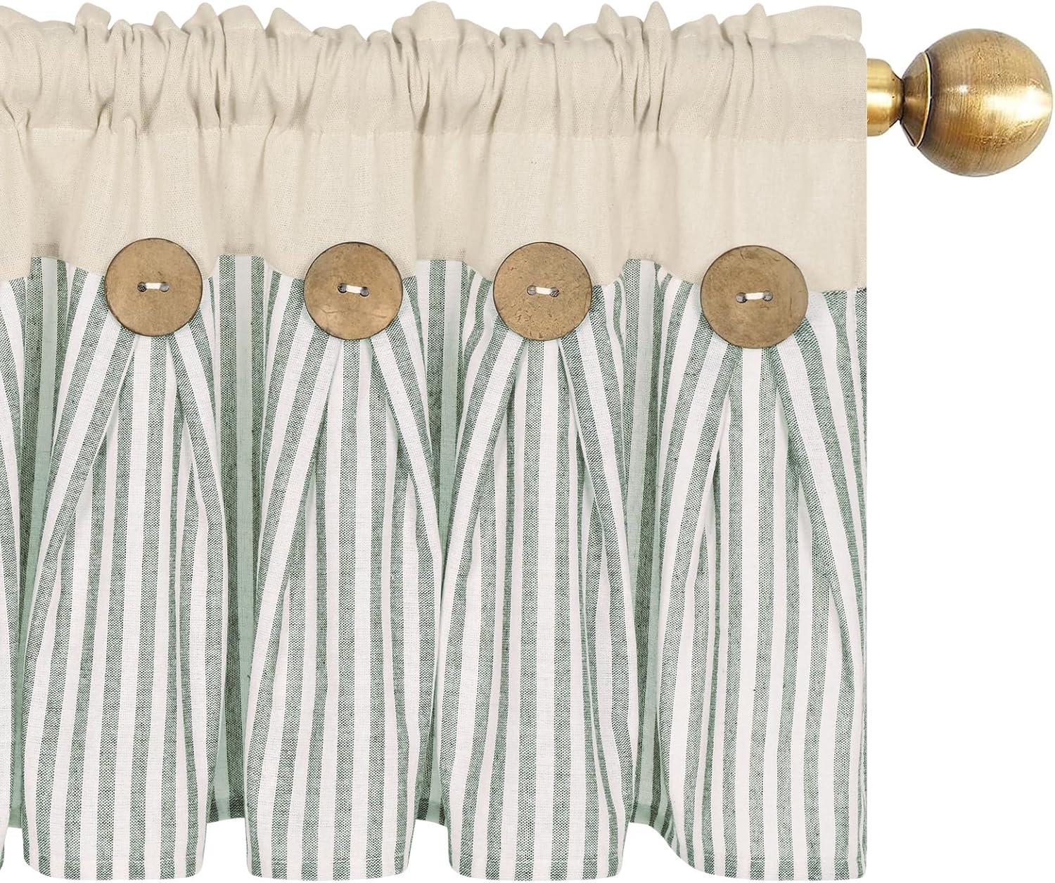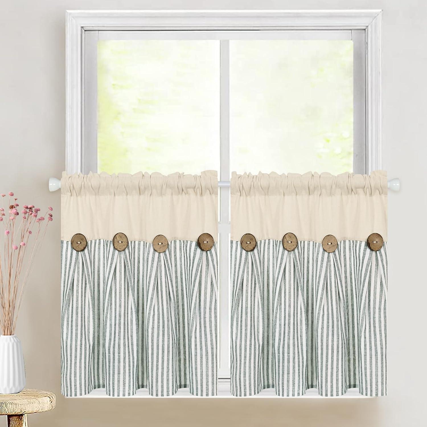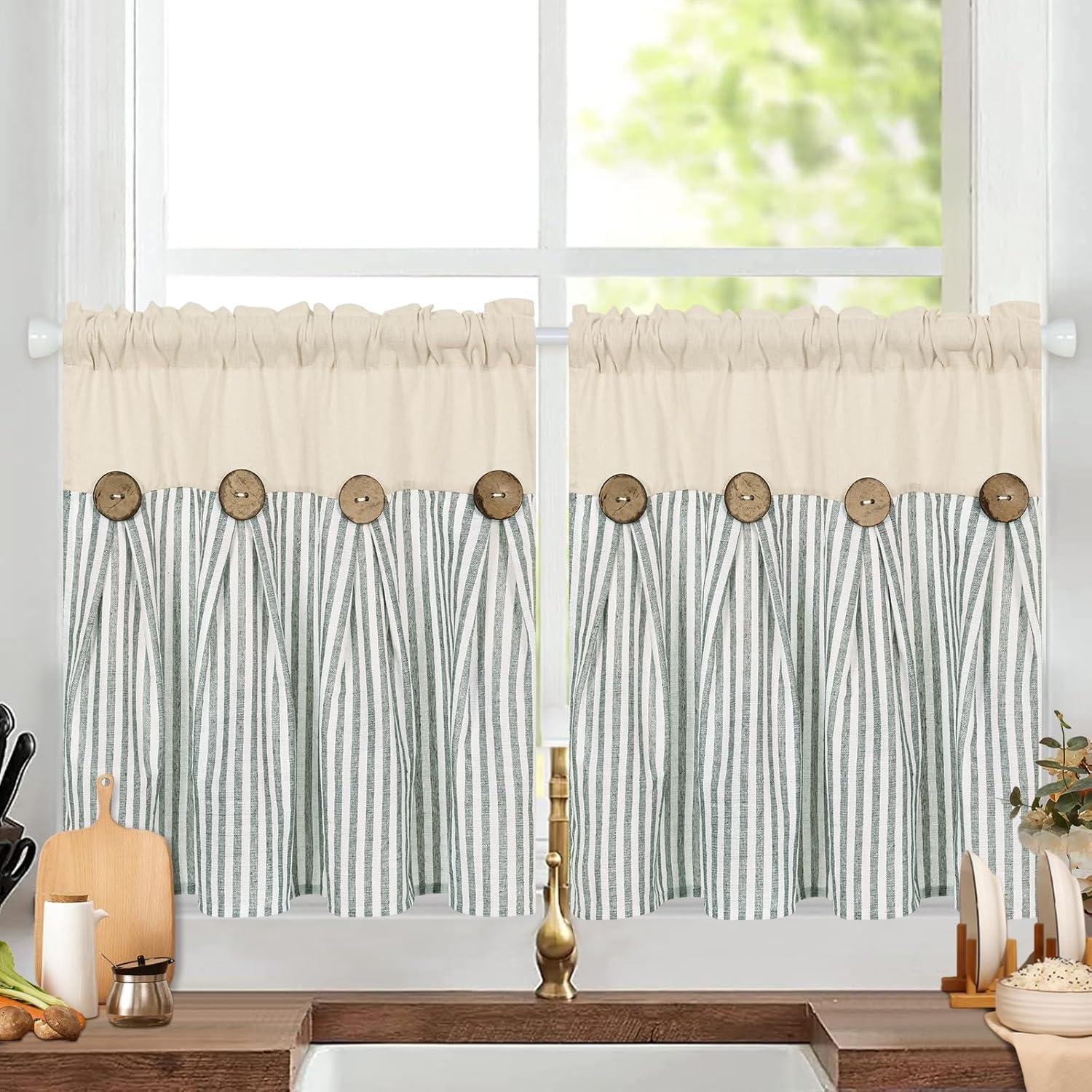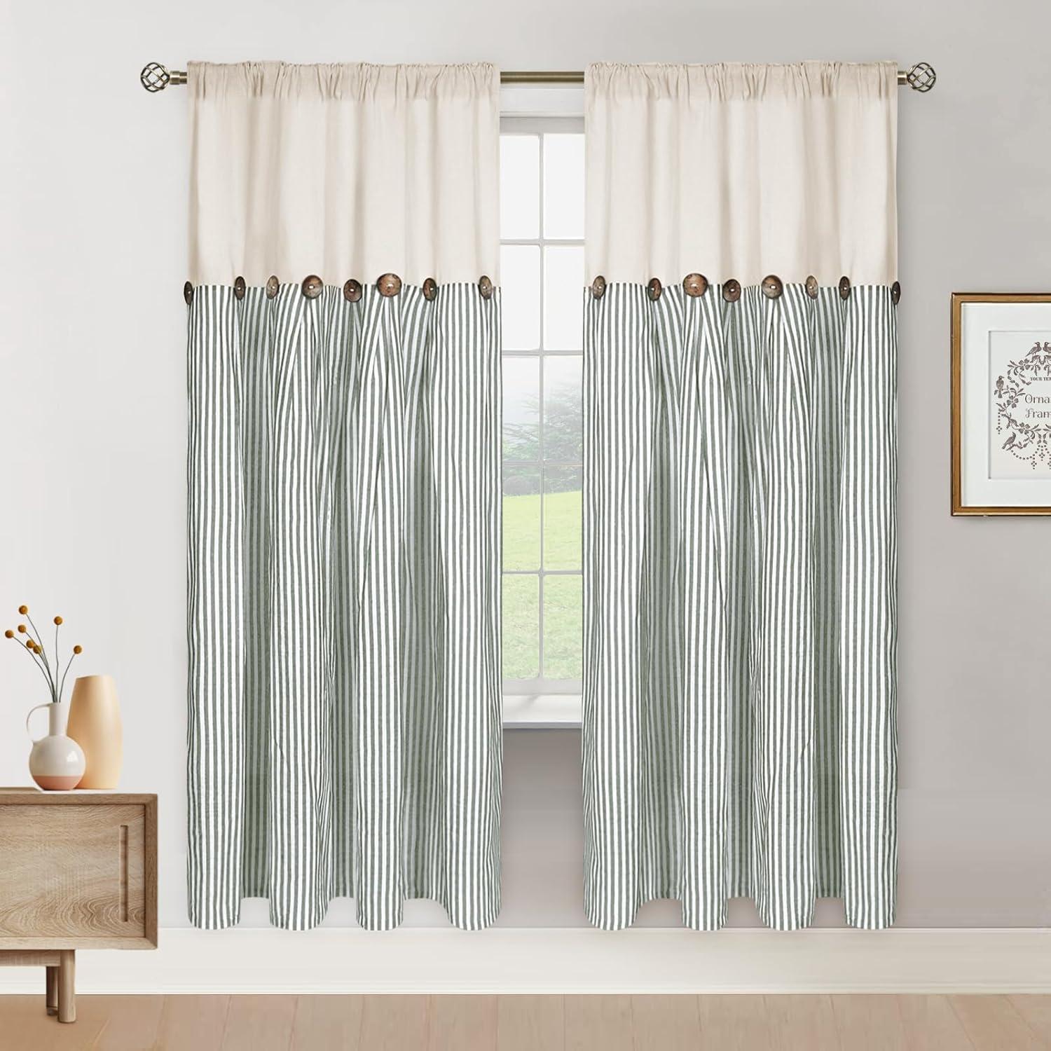ASPMIZ Cotton Linen Farmhouse Curtains Boho Rustic Button Curtain, Linen Window Curtain Panels Green Stripe Country Curtains for Living Room Bedroom, Back Tab Window Drapes, 52 x 84 Inch, 2 Panels(Beige&green)