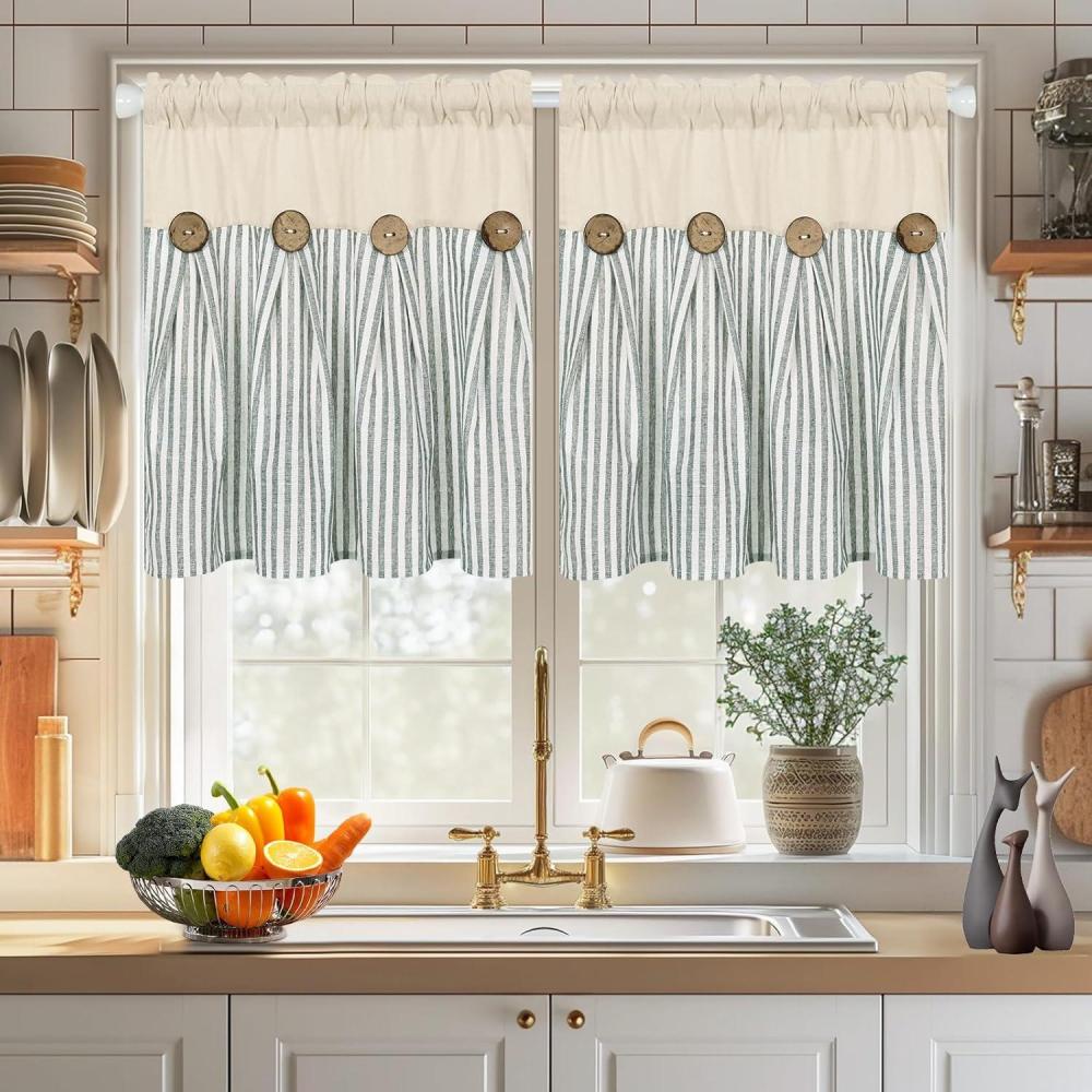 imageASPMIZ Cotton Linen Farmhouse Curtains Boho Rustic Button Curtain Linen Window Curtain Panels Green Stripe Country Curtains for Living Room Bedroom Back Tab Window Drapes 52 x 84 Inch 2 PanelsBeigegreen