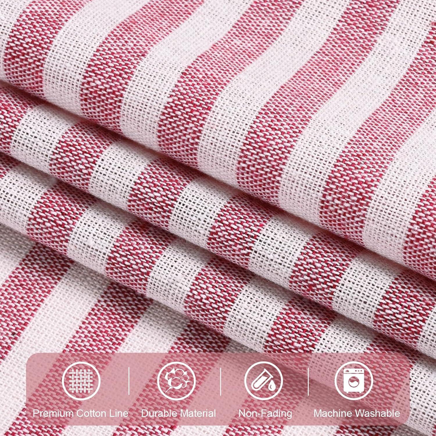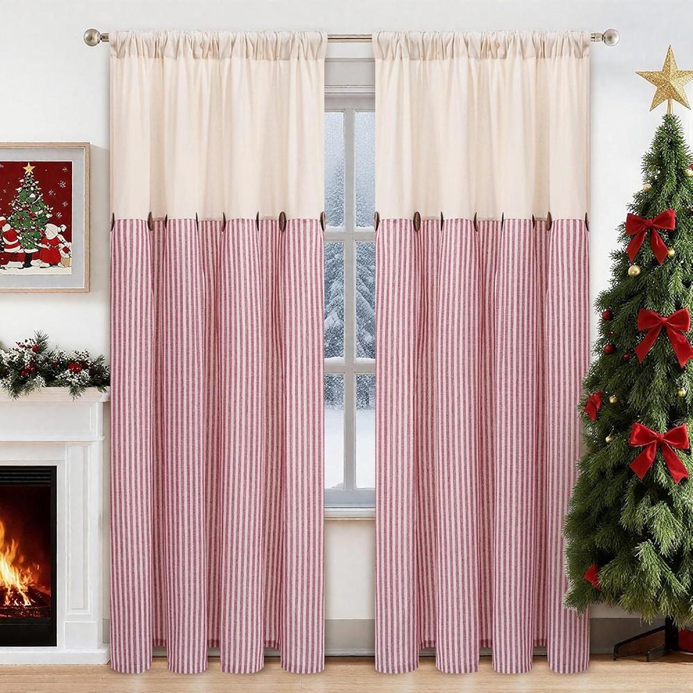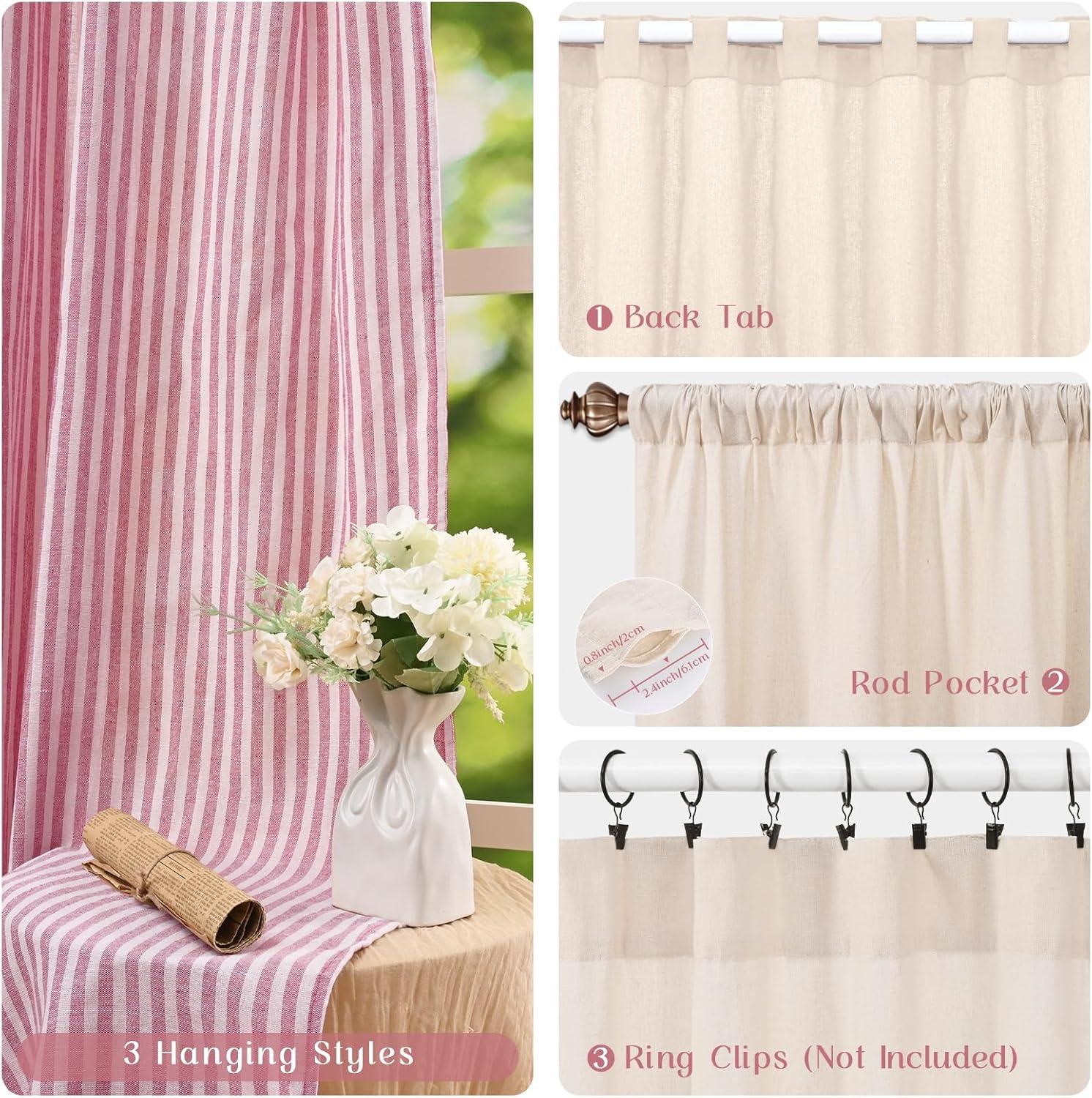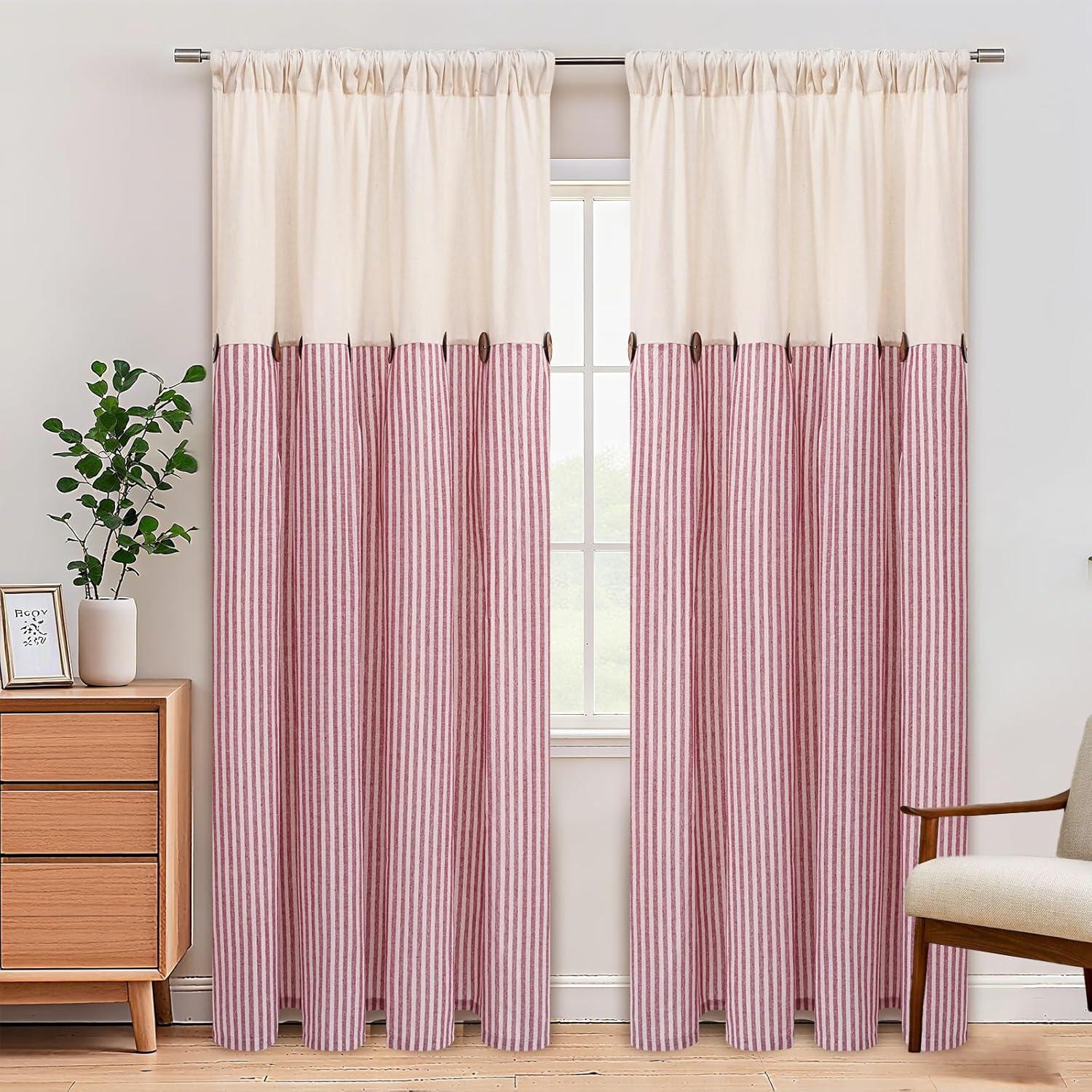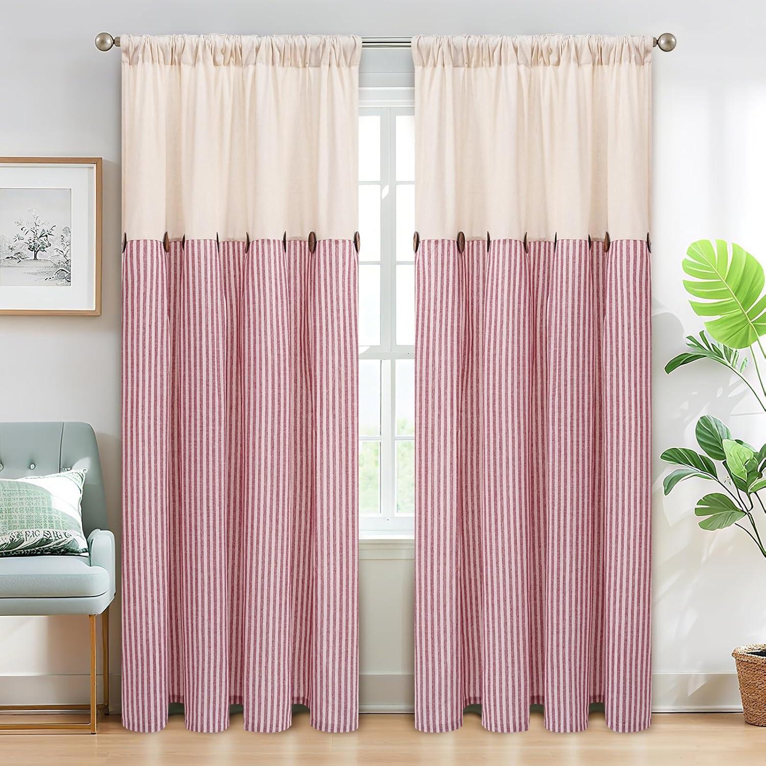 ASPMIZ Cotton Linen Farmhouse Curtains Boho Rustic Button Curtain, Linen Window Curtain Panels Green Stripe Country Curtains for Living Room Bedroom, Back Tab Window Drapes, 52 x 84 Inch, 2 Panels(Beige&red)