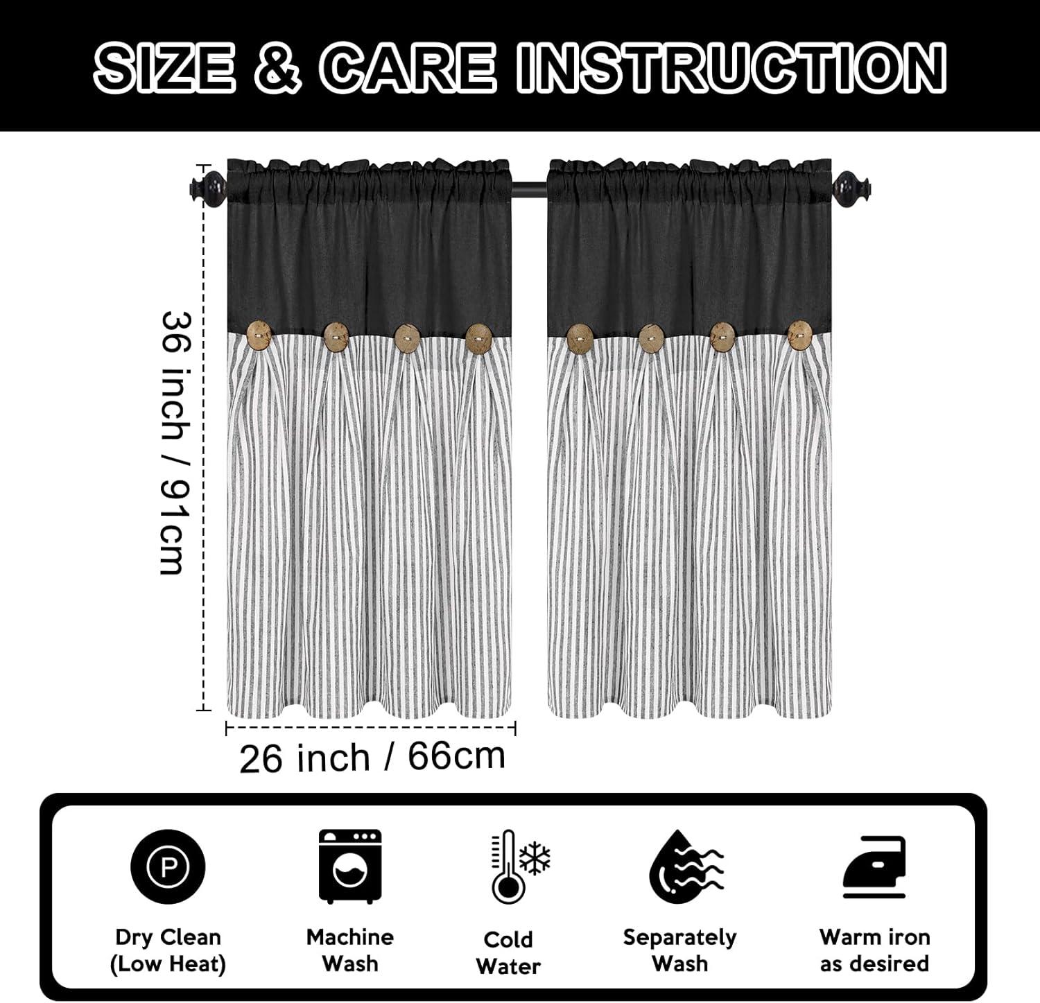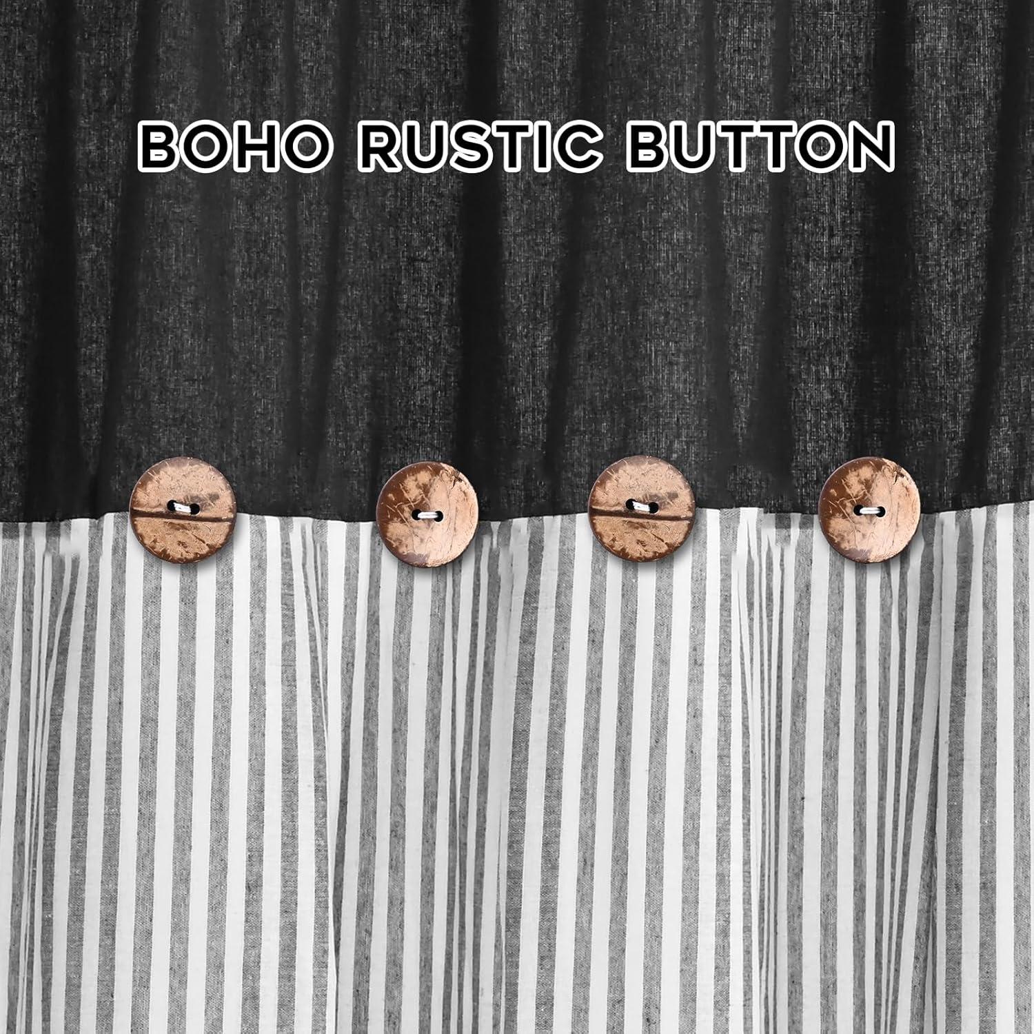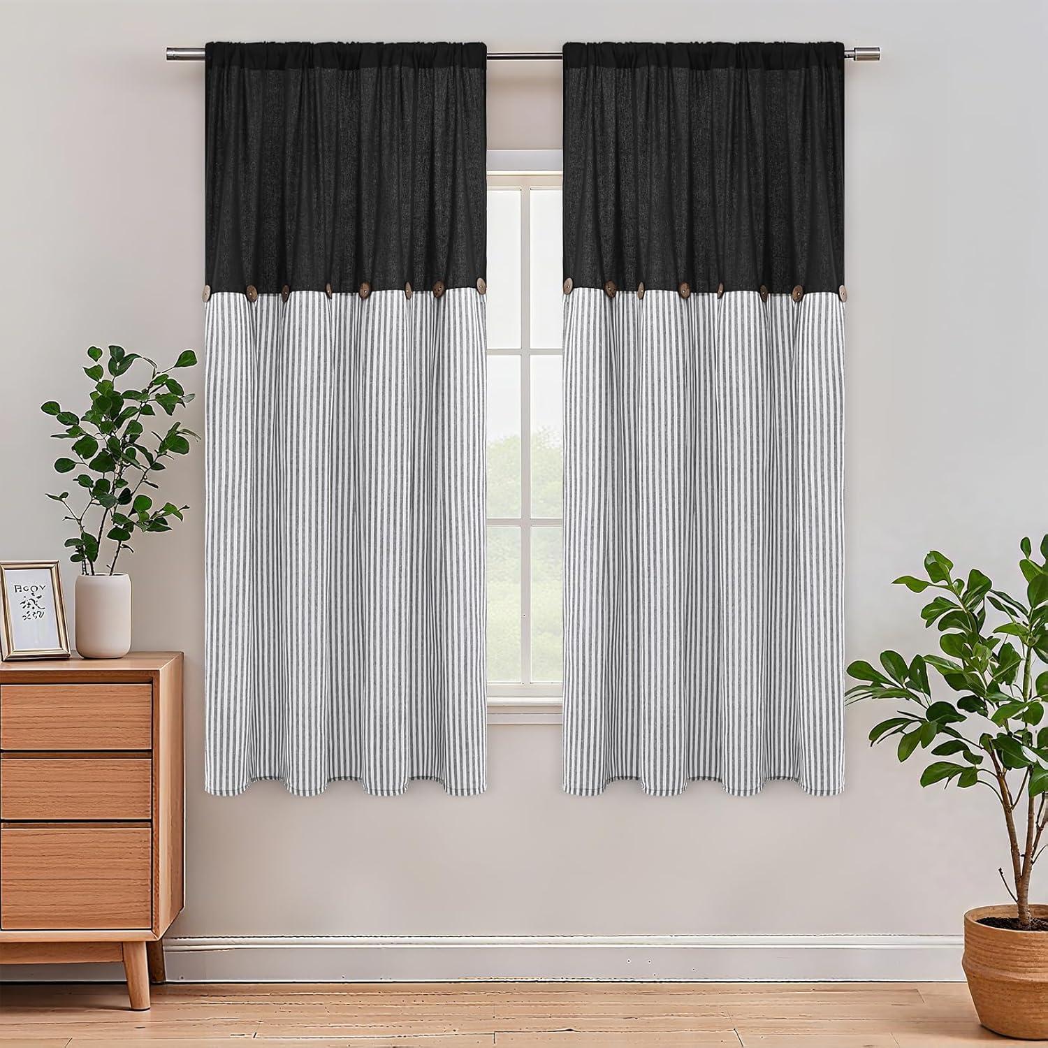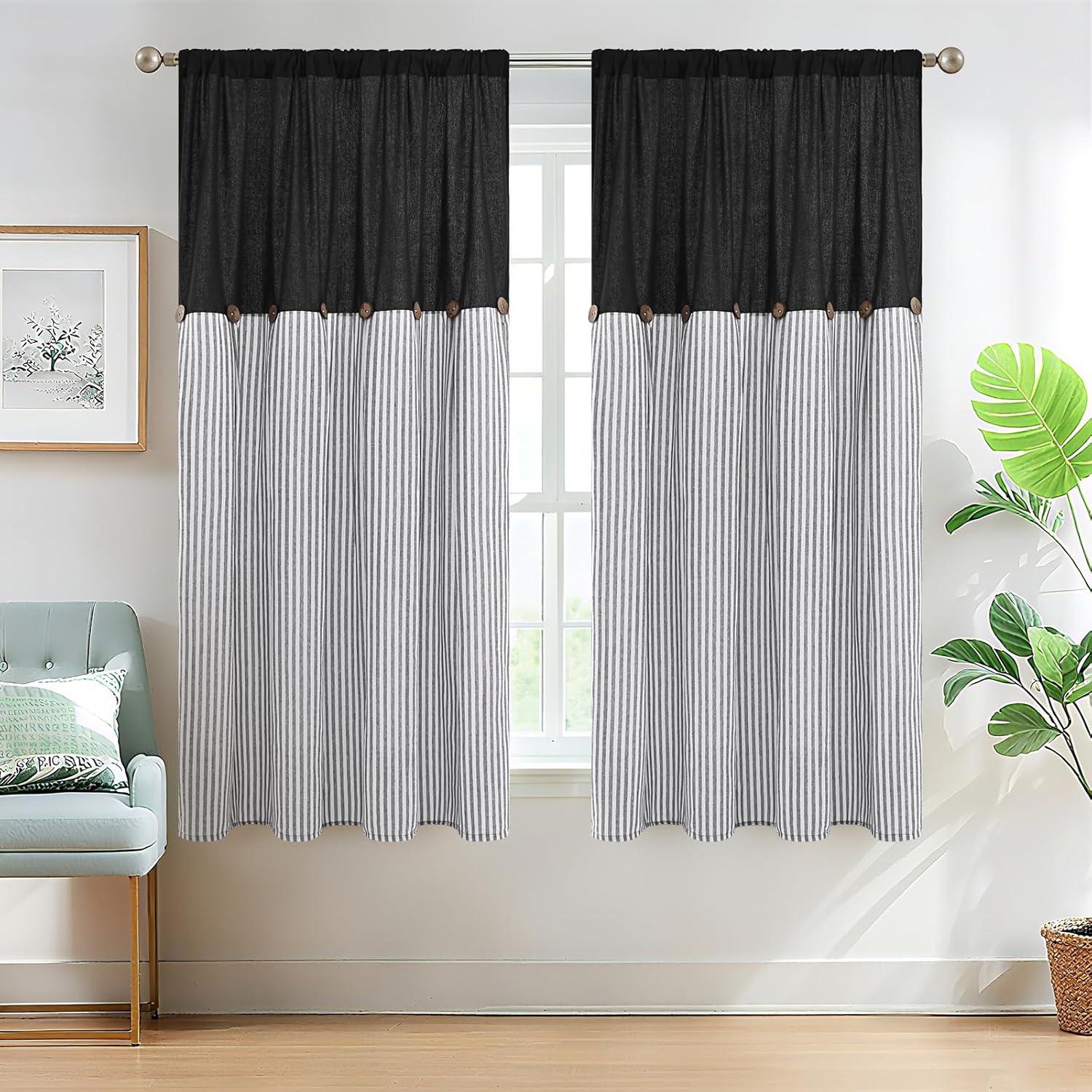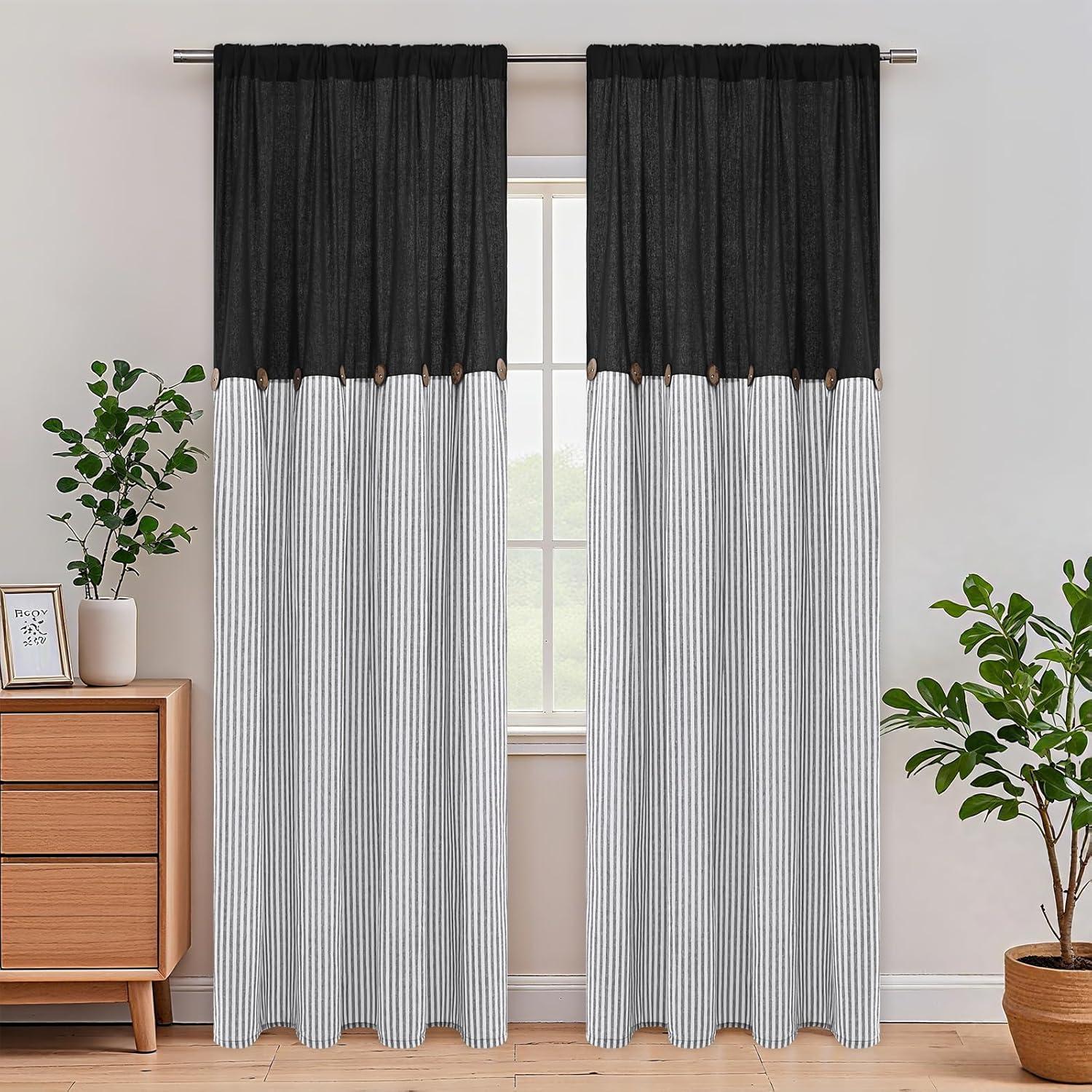 ASPMIZ Cotton Linen Farmhouse Curtains Boho Rustic Button Curtain, Linen Window Curtain Panels Green Stripe Country Curtains for Living Room Bedroom, Back Tab Window Drapes, 52 x 84 Inch, 2 Panels(Black&grey)
