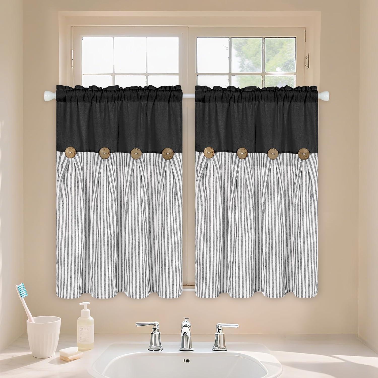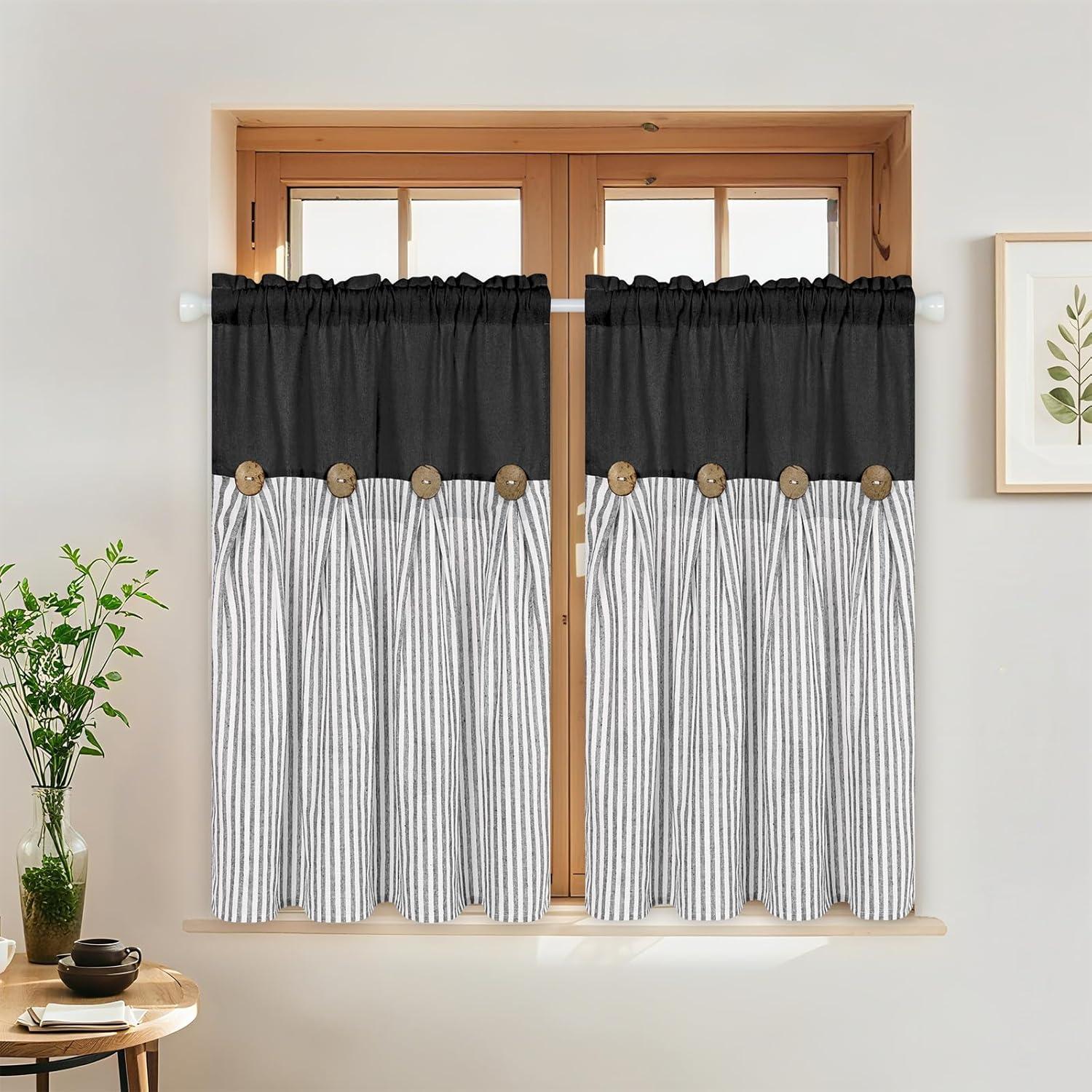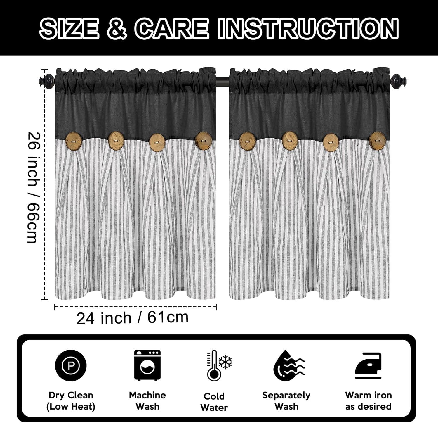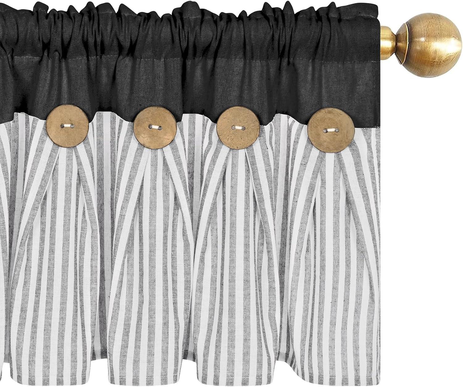 ASPMIZ Cotton Linen Farmhouse Curtains Boho Rustic Button Curtain, Linen Window Curtain Panels Green Stripe Country Curtains for Living Room Bedroom, Back Tab Window Drapes, 52 x 84 Inch, 2 Panels(Black&grey)