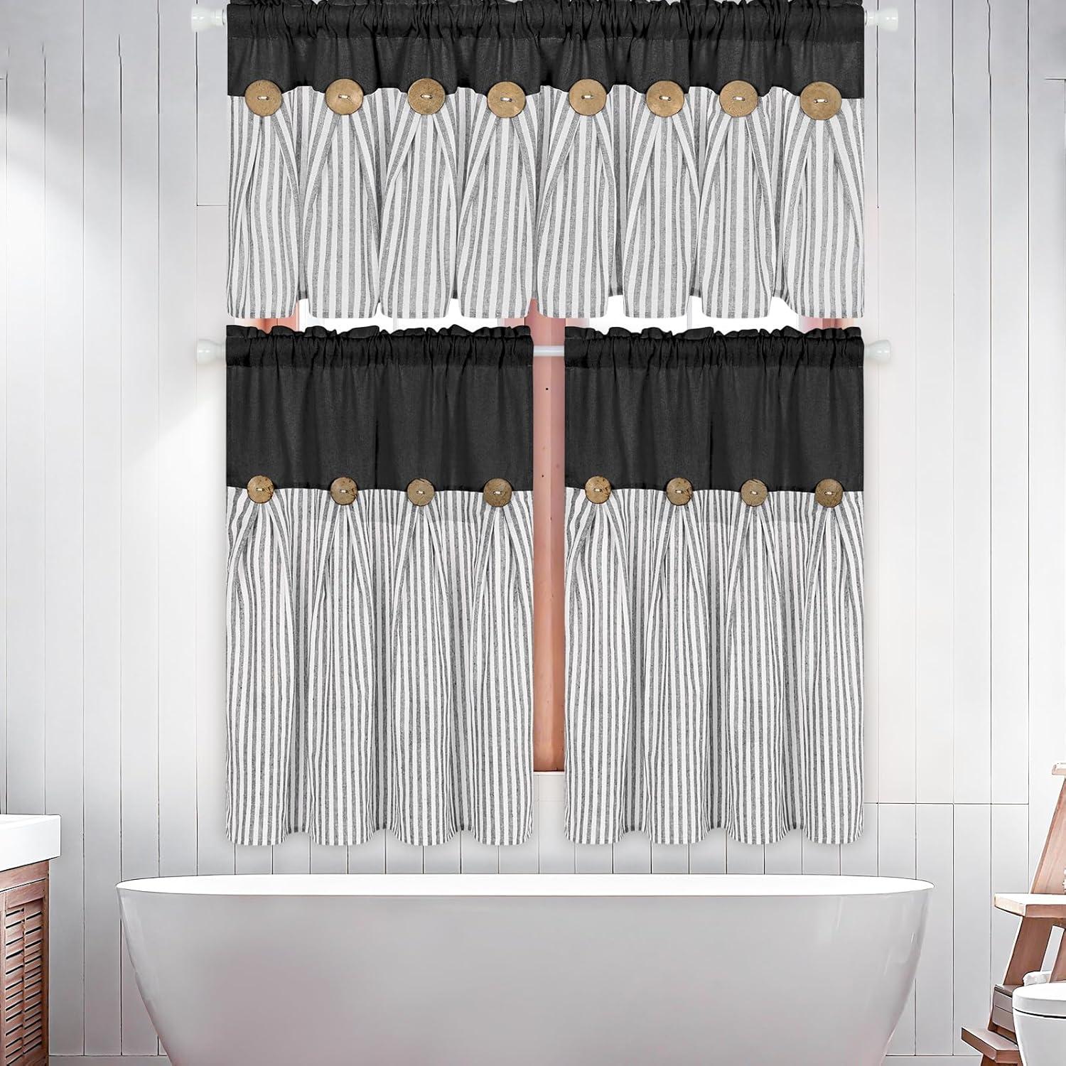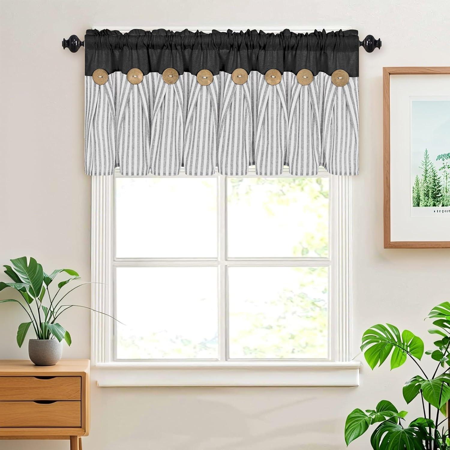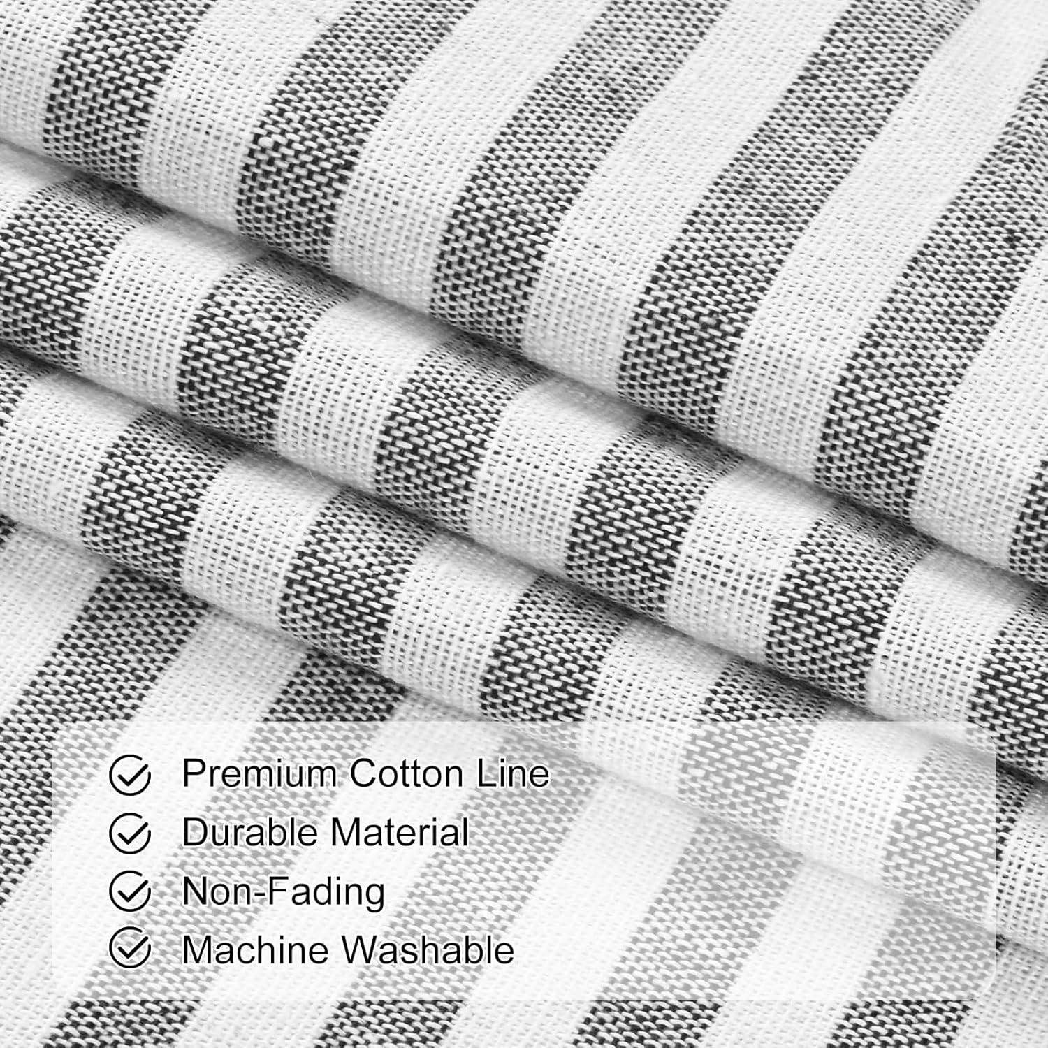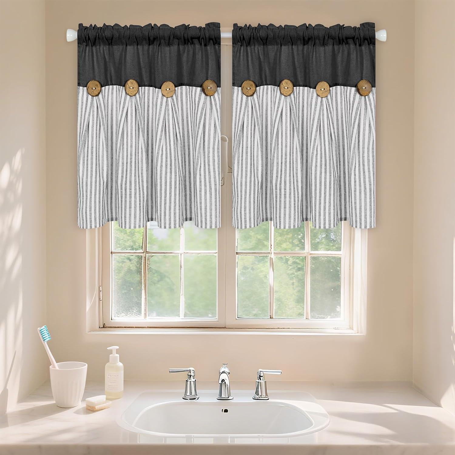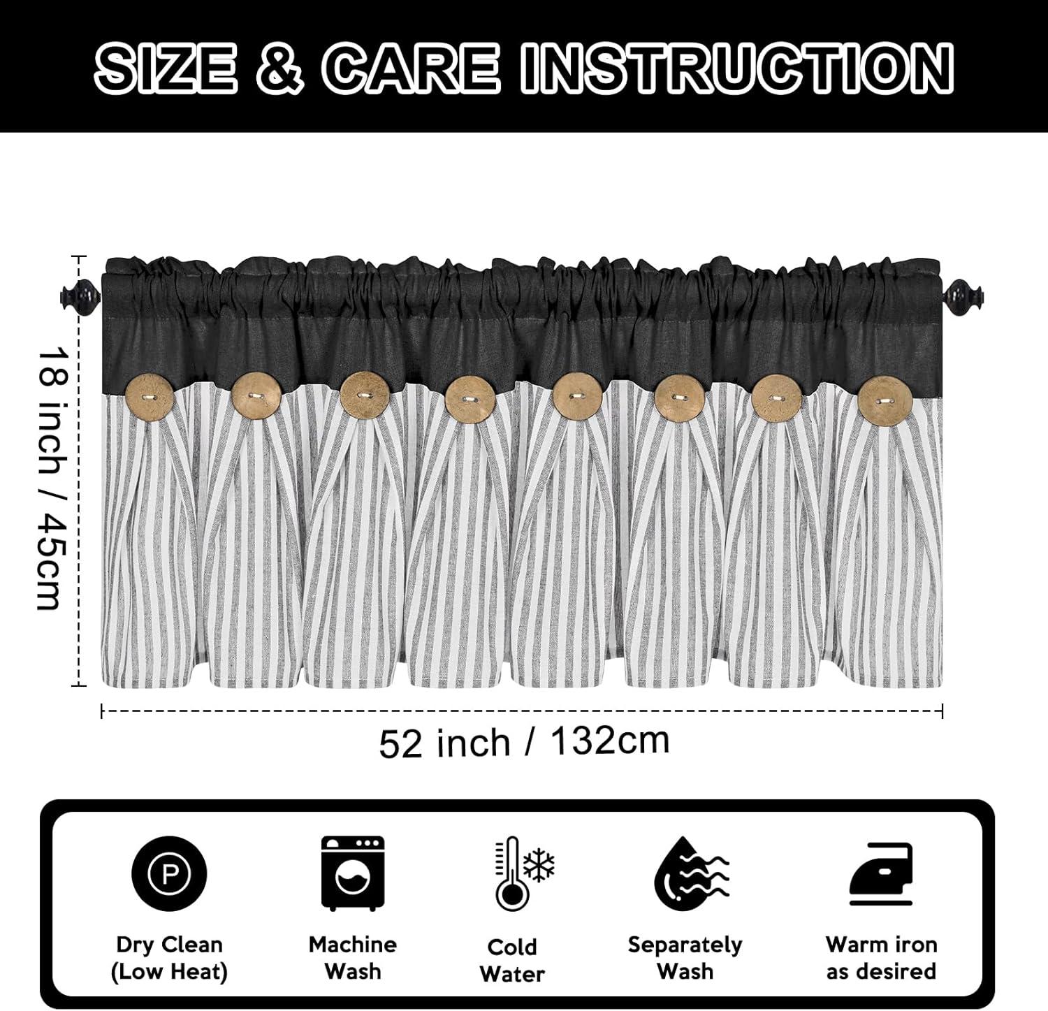 ASPMIZ Cotton Linen Farmhouse Curtains Boho Rustic Button Curtain, Linen Window Curtain Panels Green Stripe Country Curtains for Living Room Bedroom, Back Tab Window Drapes, 52 x 84 Inch, 2 Panels(Black&grey)