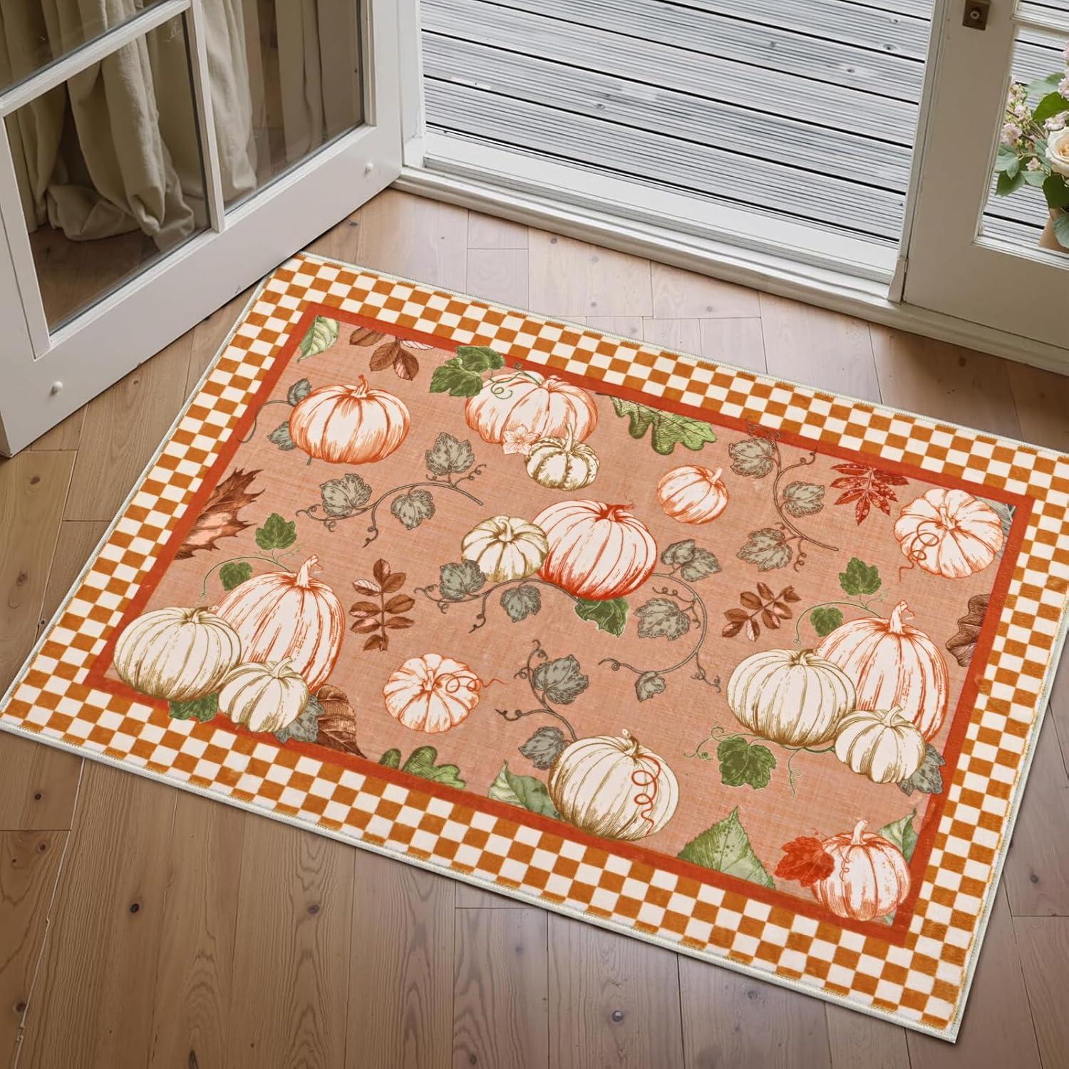 ASPMIZ Fall Area Rugs 3×5, Plaid Living Room Rug Maple Leaves Washable Rug, Orange Bedroom Rugs for Living Room, Soft Faux Wool Throw Carpet fpr Entryway, Office, Nursery, Red(Pumpkin – Orange)
