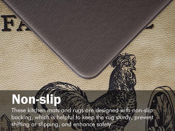 🐓NON SLIP & PVC: The retro PVC kitchen rugs and mats set is crafted from PVC material that boasts non-skid properties. Thanks to anti-skid texture and non-slip backing, this floor mat stays securely in place, effectively preventing slips and falls even in high-traffic areas.
