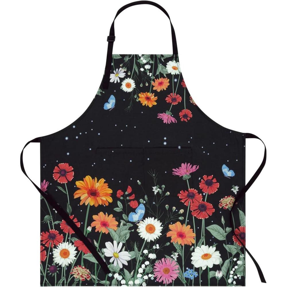【Material and Size】: The flower apron black measure is 27.5 x 31.5 Inches, made of high quality waterproof polyester cotton, lightweight, soft and durable, which can protect against water, splashing oil, kitchen grease, spills and food stains efficiently.
