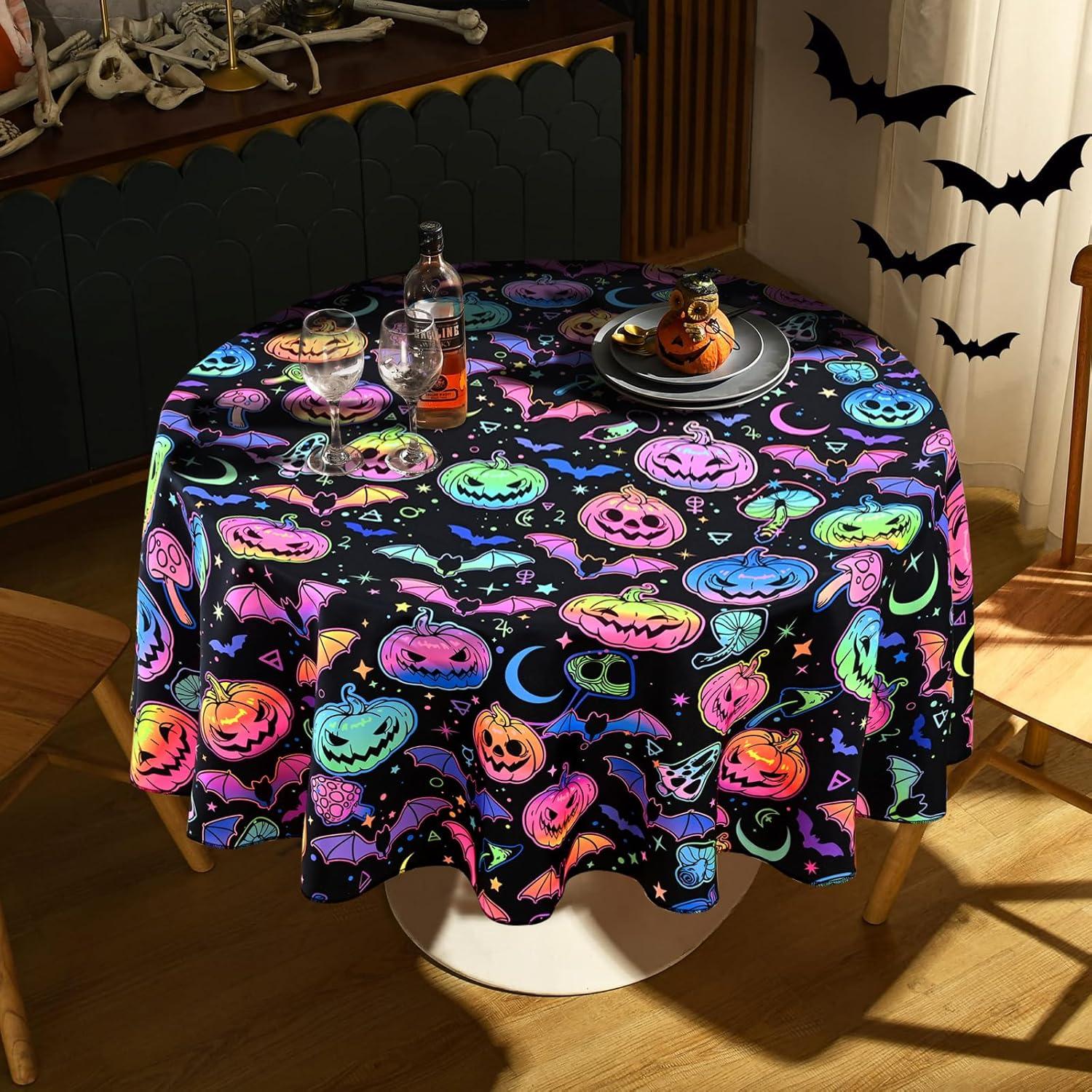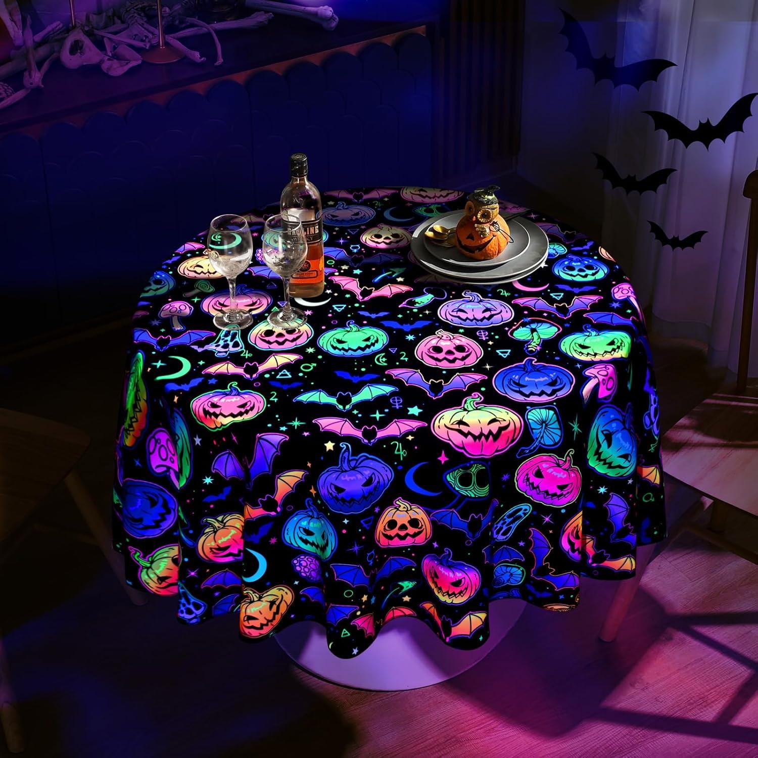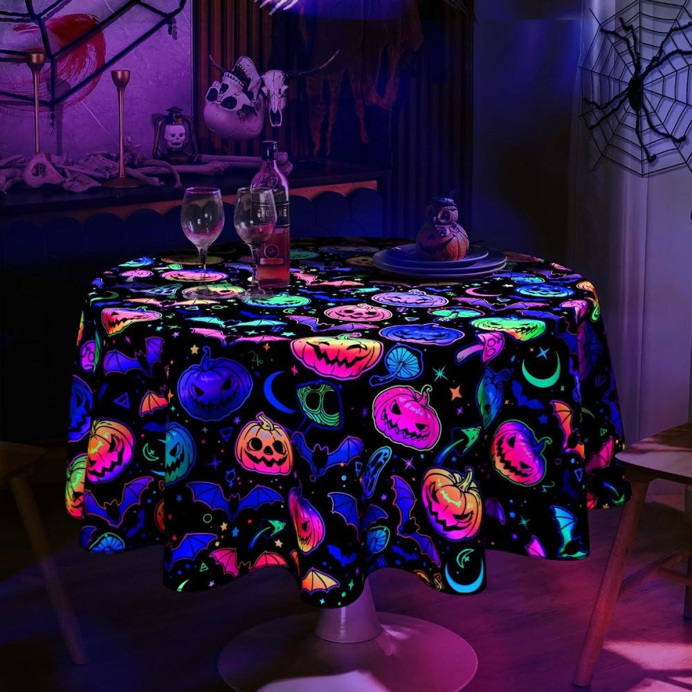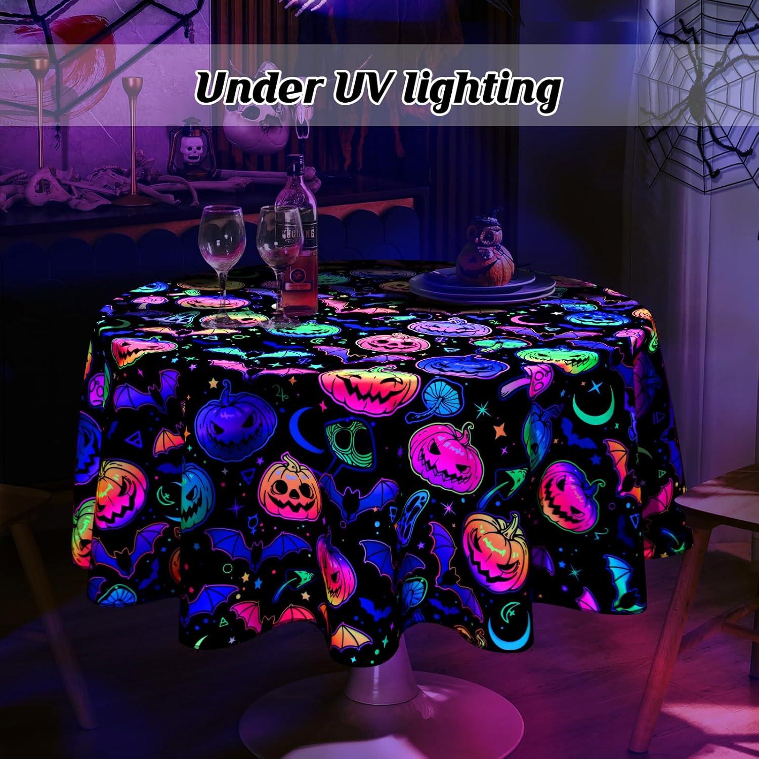 【Halloween Decorations】Our Halloween tablecloth round is designed with classic patterns related to Halloween theme, such as spooky pumpkin, and bat, It shows a horrible fluorescent effect under ultraviolet light, creating a strong and spooky Halloween atmosphere.
