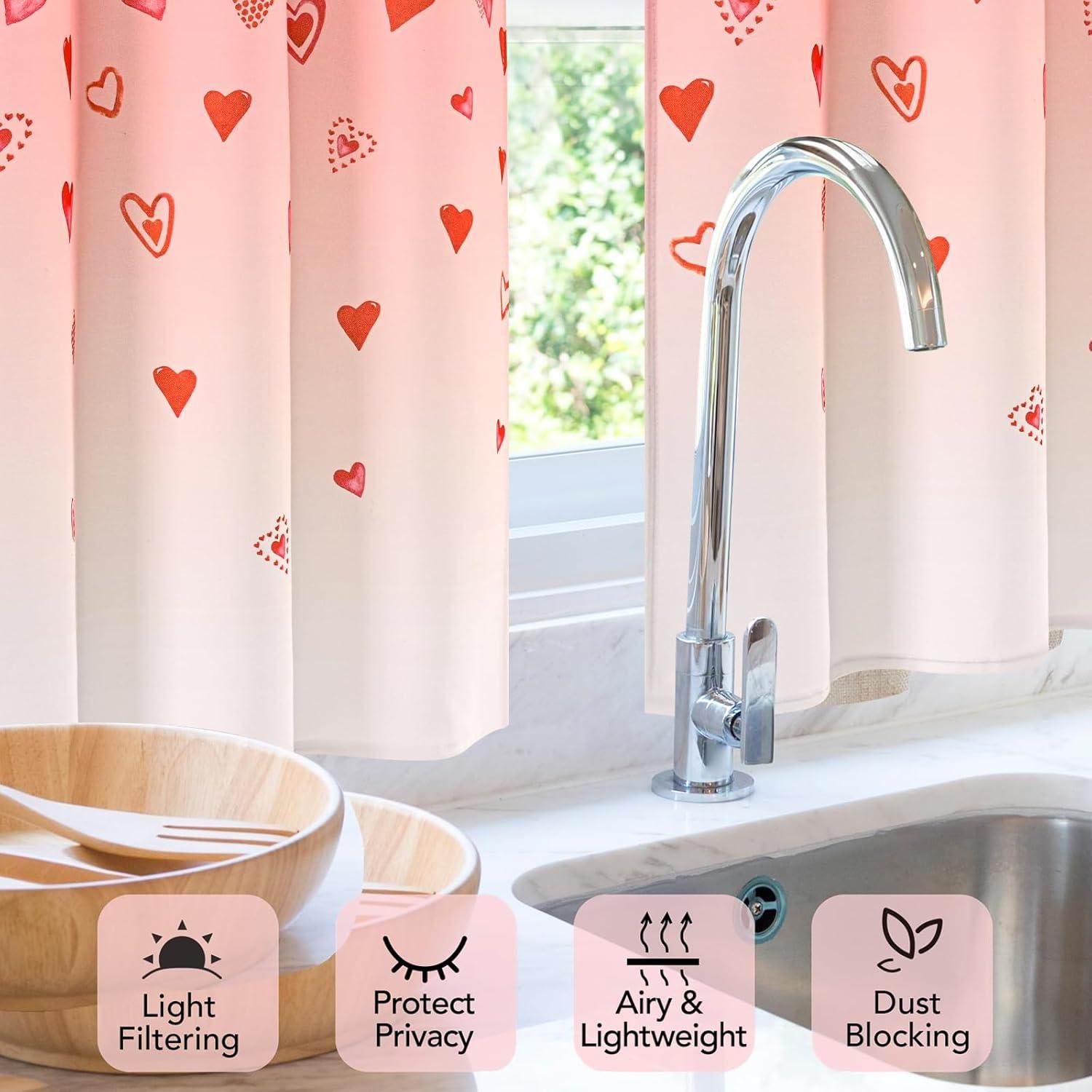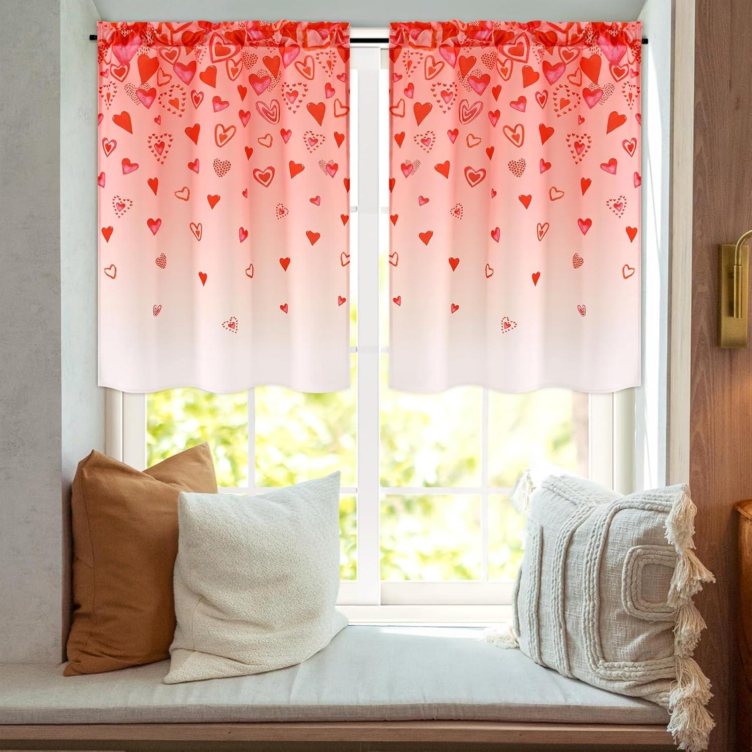 Valentines Day Decorations: Valentine's Day kitchen curtains are printed with pink and red falling love hearts patterns, a classic love element design. Romantic Valentine's Day window decorations